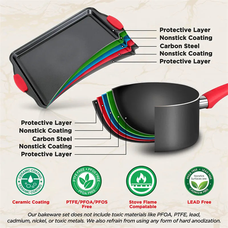 - UNIVERSAL COOKING: These pots and pans and utensil set are safe for use on gas, electric and ceramic hobs. Made of pressed aluminum metal with a coating thickness of 20-25um, 2.2mm multi-layer cookware
