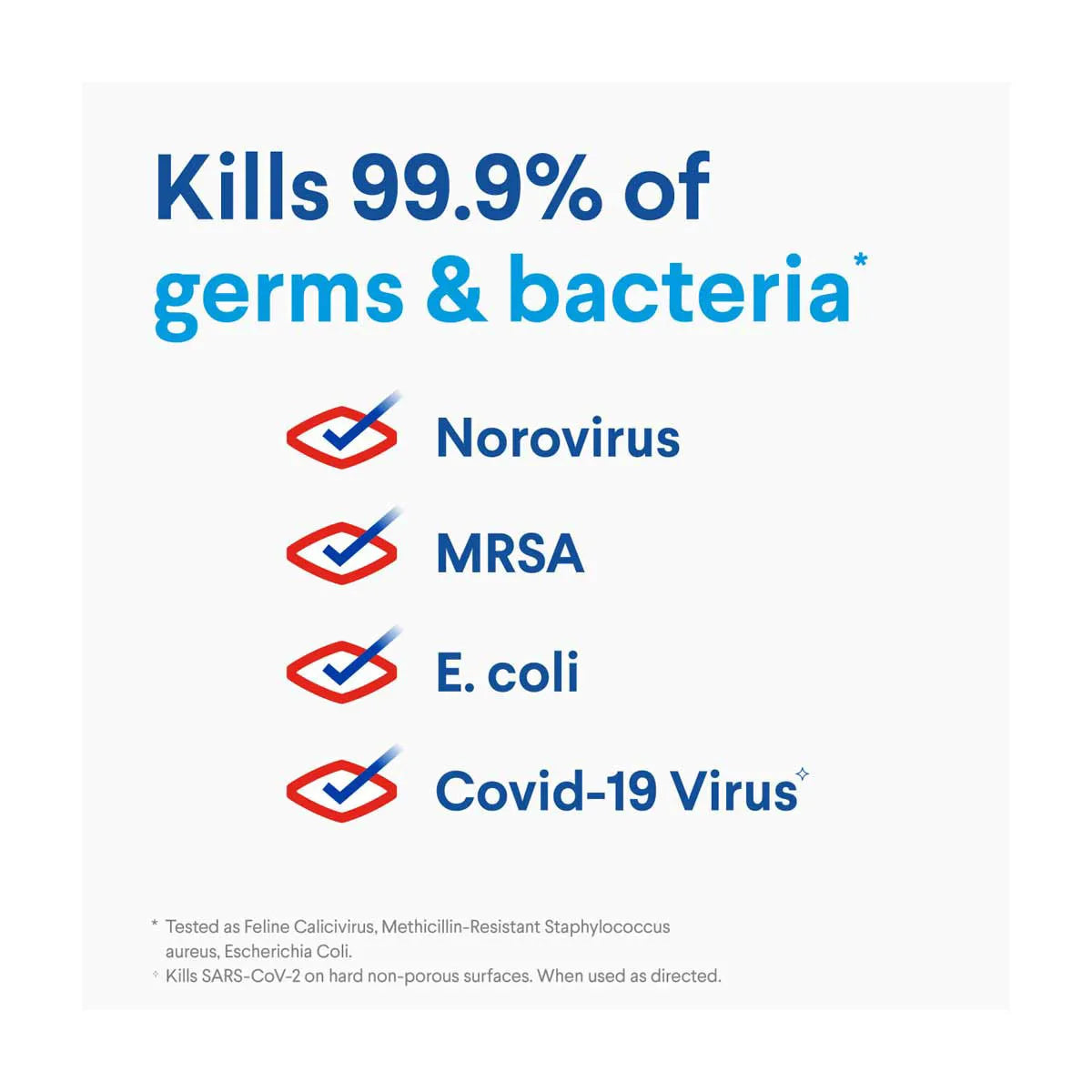 - Disinfectant: This cleaning bleach kills 99.9% of household germs and bacteria including norovirus, flu virus, MRSA, E. Coli, and Salmonella left on household surfaces with cleaning and disinfecting power