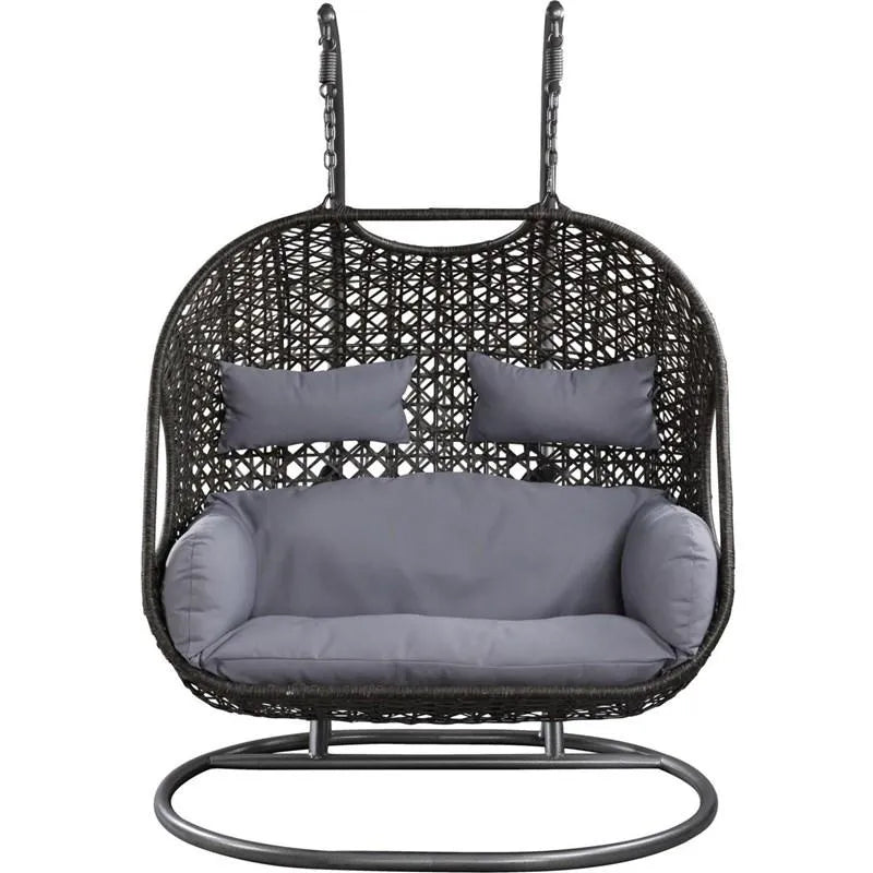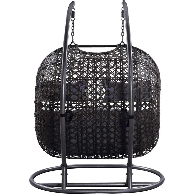 Fall into a fairytale world, a sci-fi fantasy, or a historic biographic adventure as you nest in this fun egg-shaped porch swing chair. This chair is a powder-coated solid steel frame and commercial grade hand woven all-weather PE rattan wicker that does not splinter like natural rattan. The cushion is made from outdoor fabric and filled with soft Cotton, breathable design. The combination of these materials ensures that the chair is weather-resistant yet stylishly comfortable. It fits two people and enough space for any position that you like.Sit in luxurious comfort while surrounded by the peace and beauty of your backyard, or enjoys a good book indoors with this comfortable hanging chair.