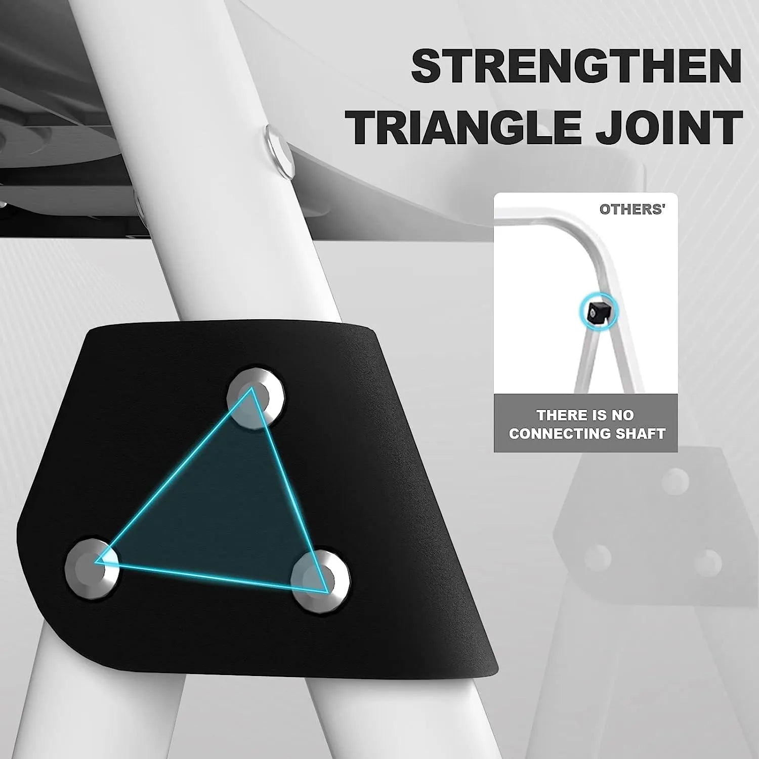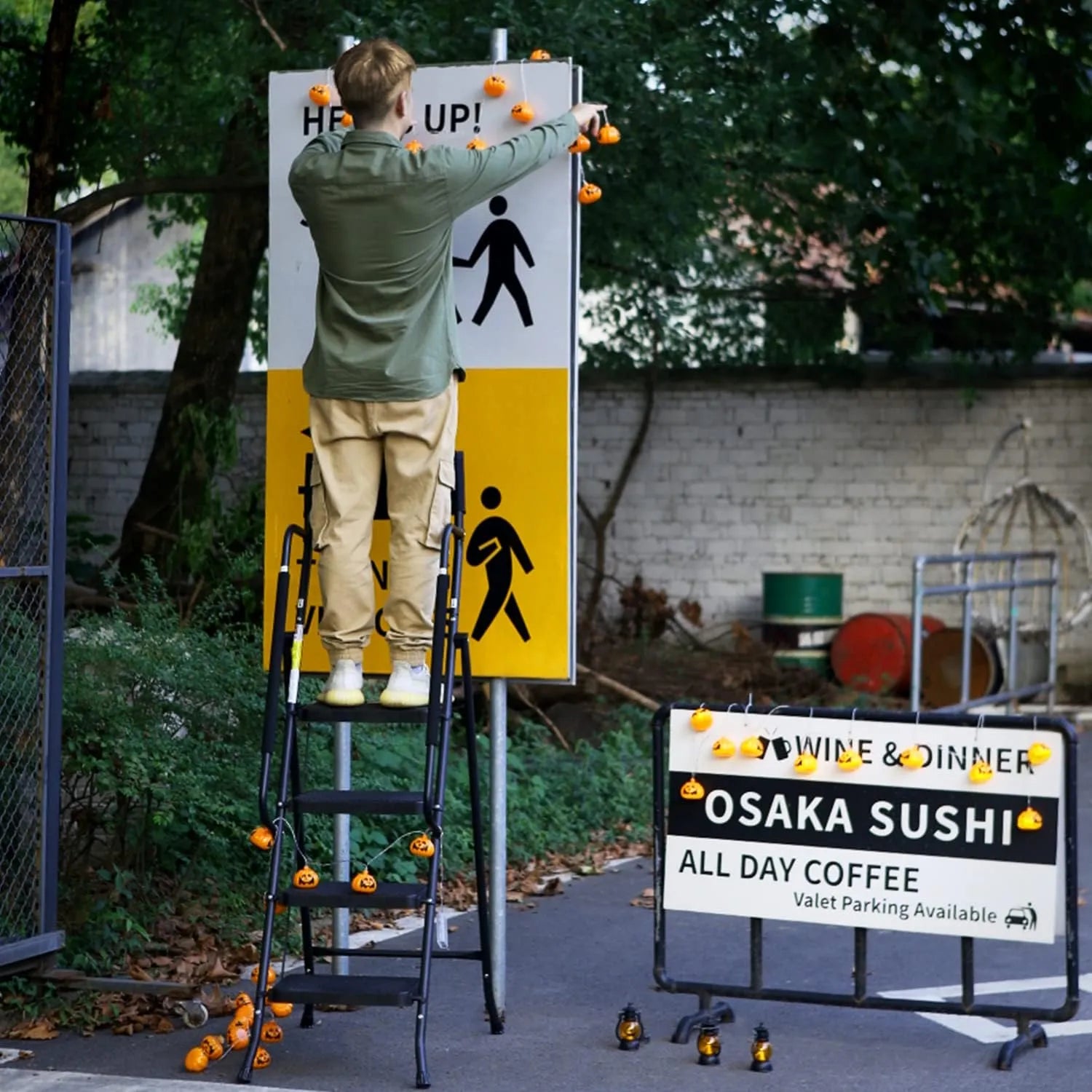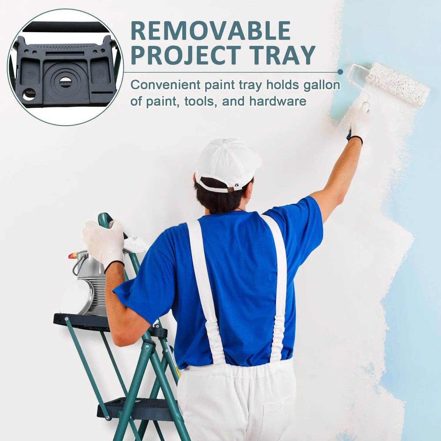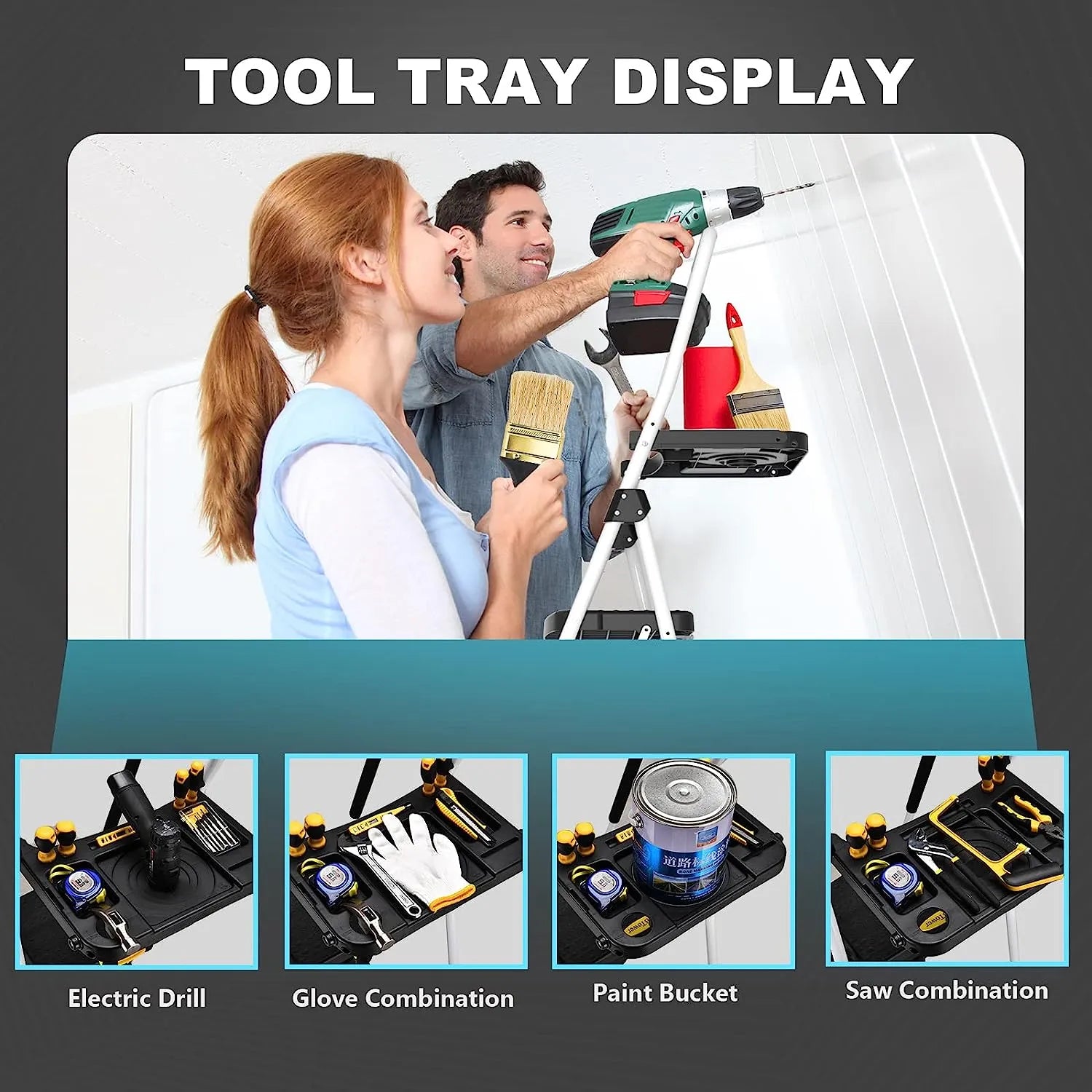 - SECURITY AND STABILITY—High-grade steel frame is constructed with strength and reliability. Metal safe buckle automatically locked in place when you use the step ladder. The back cross brace structure reinforce the basic support which will make you feel more safe climbing up the step ladder.