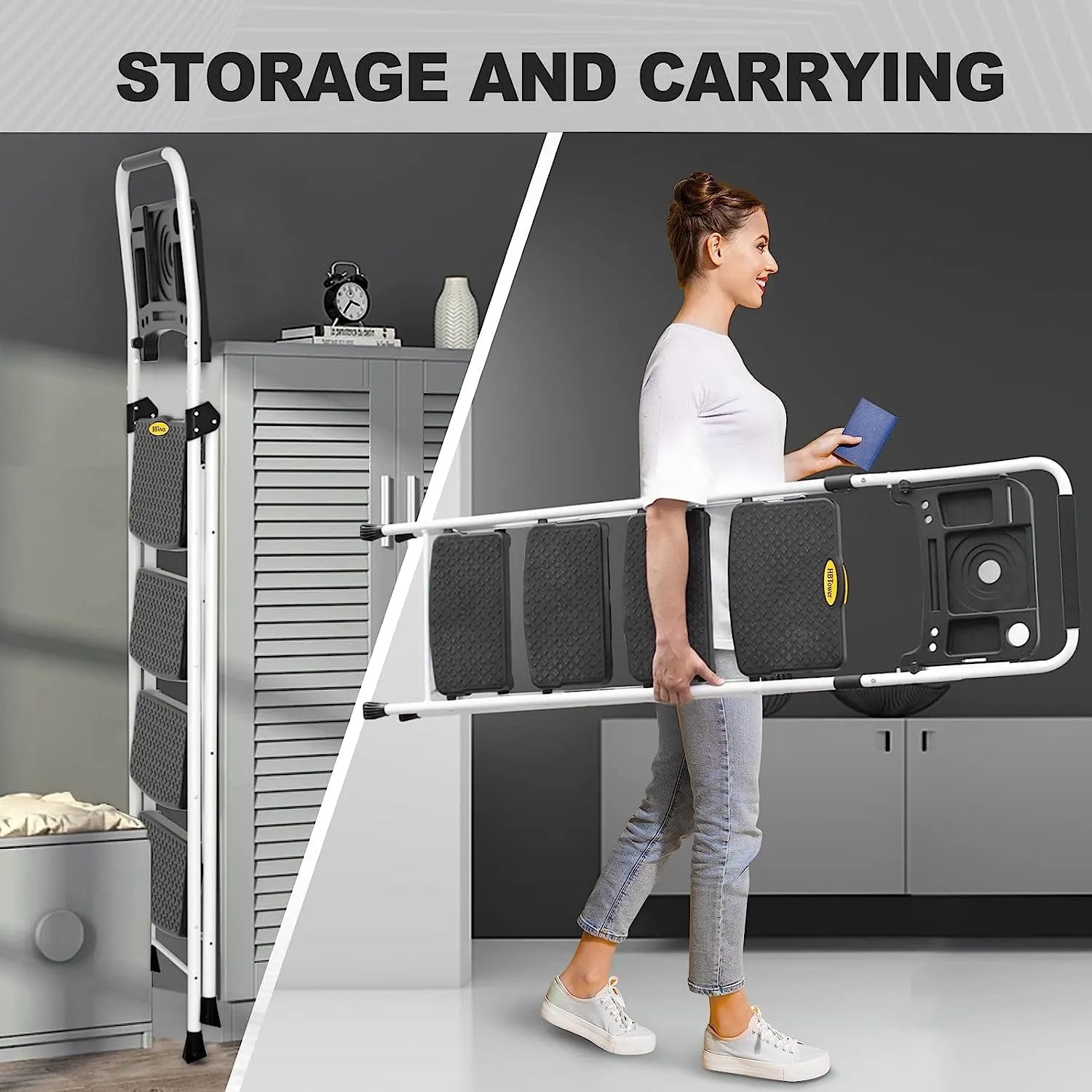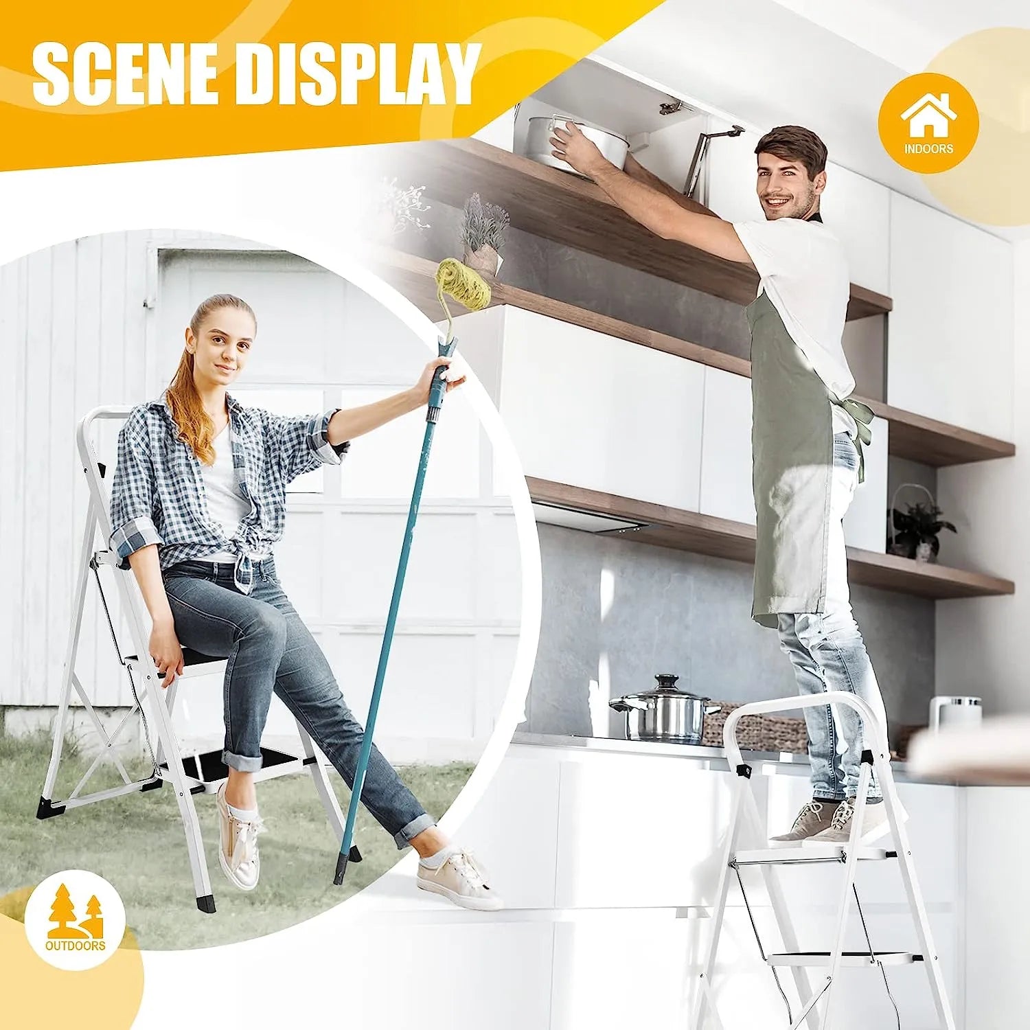- PORTABLE AND SPACE-SAVING: This Folding Step Stools Comes fully assembled!Lock and open system for easily open and fold. It folded to just 1.6" D for storage and transportation. Easy to carry for using indoor or outdoor.