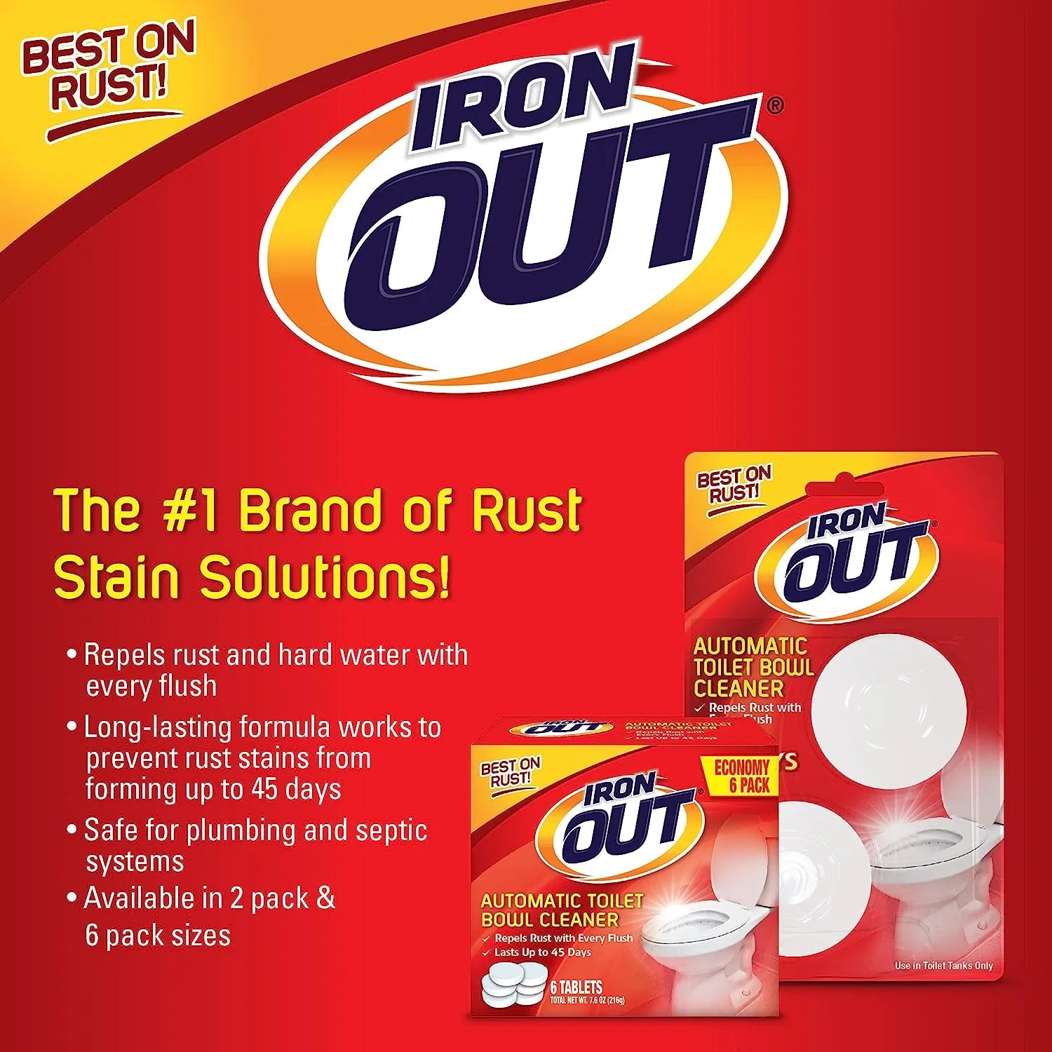 - Simply drop tablet in toilet tank and let Iron OUT do the work for you