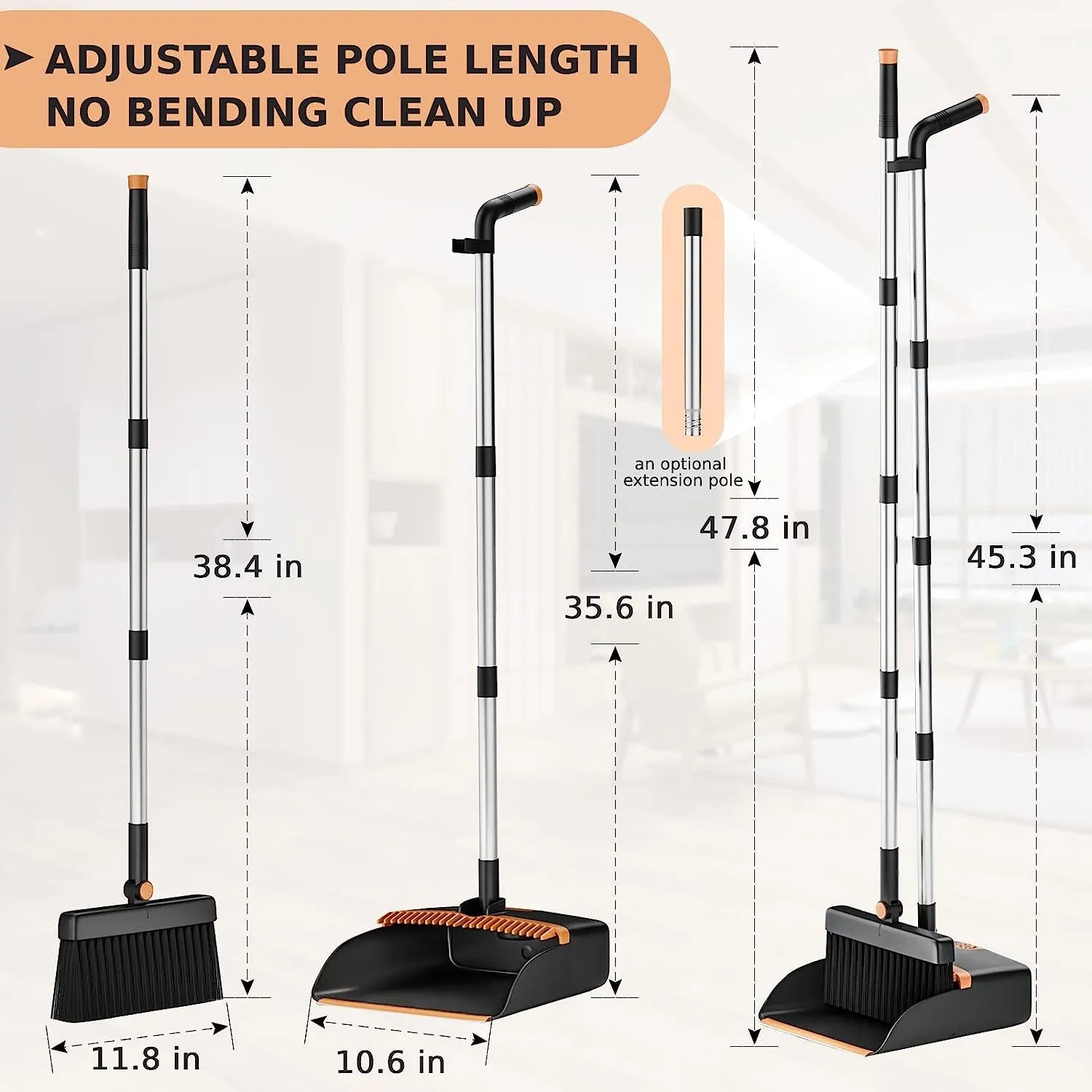 - Long Handle Broom and Dustpan Set: The broom and dustpan set for the home have a 48" long handle broom, which allows you to sweep comfortably upright without bending over. The broom handle consists of a detachable 22 mm diameter stainless steel pole, ensuring the broom is rust-resistant and structurally strong.