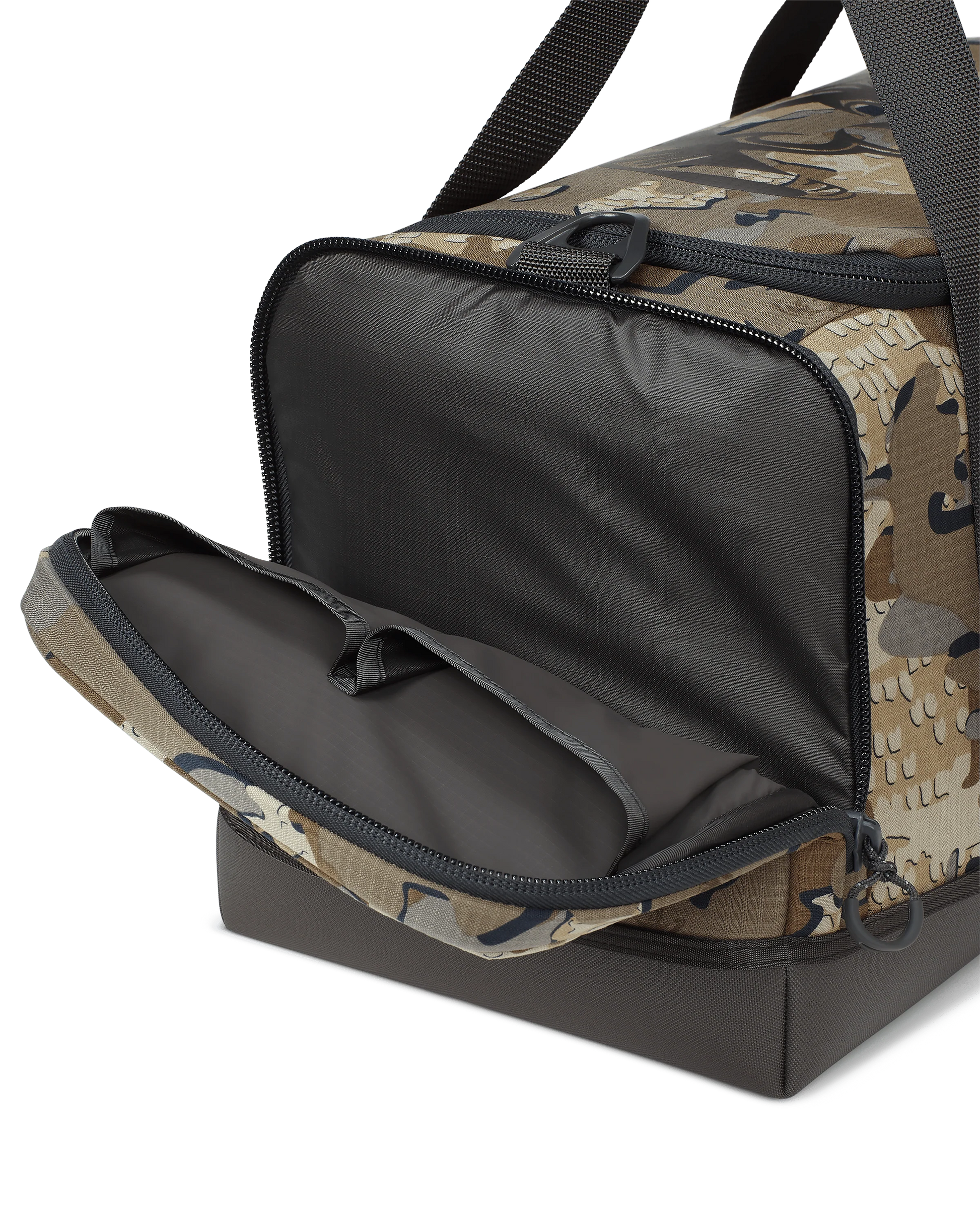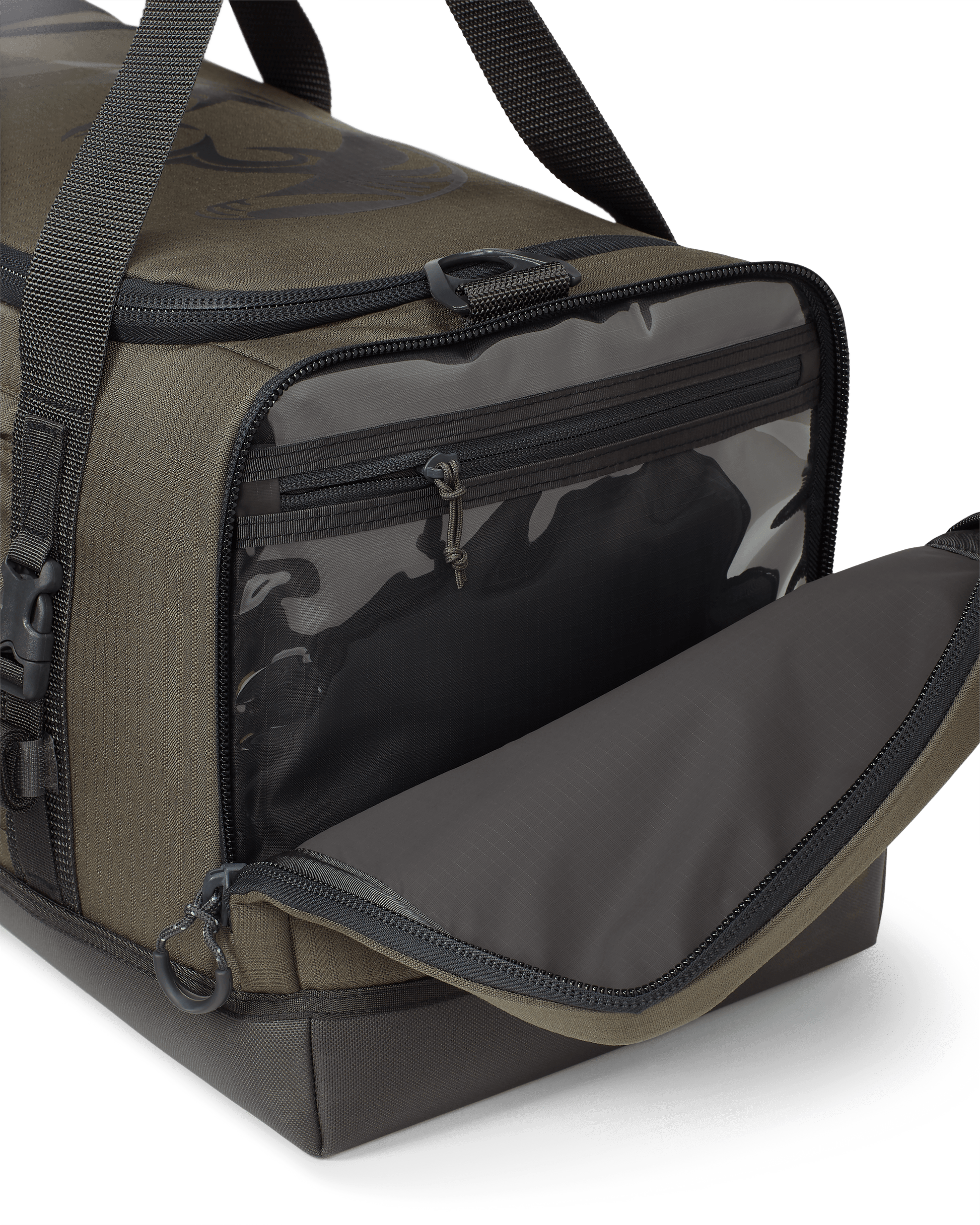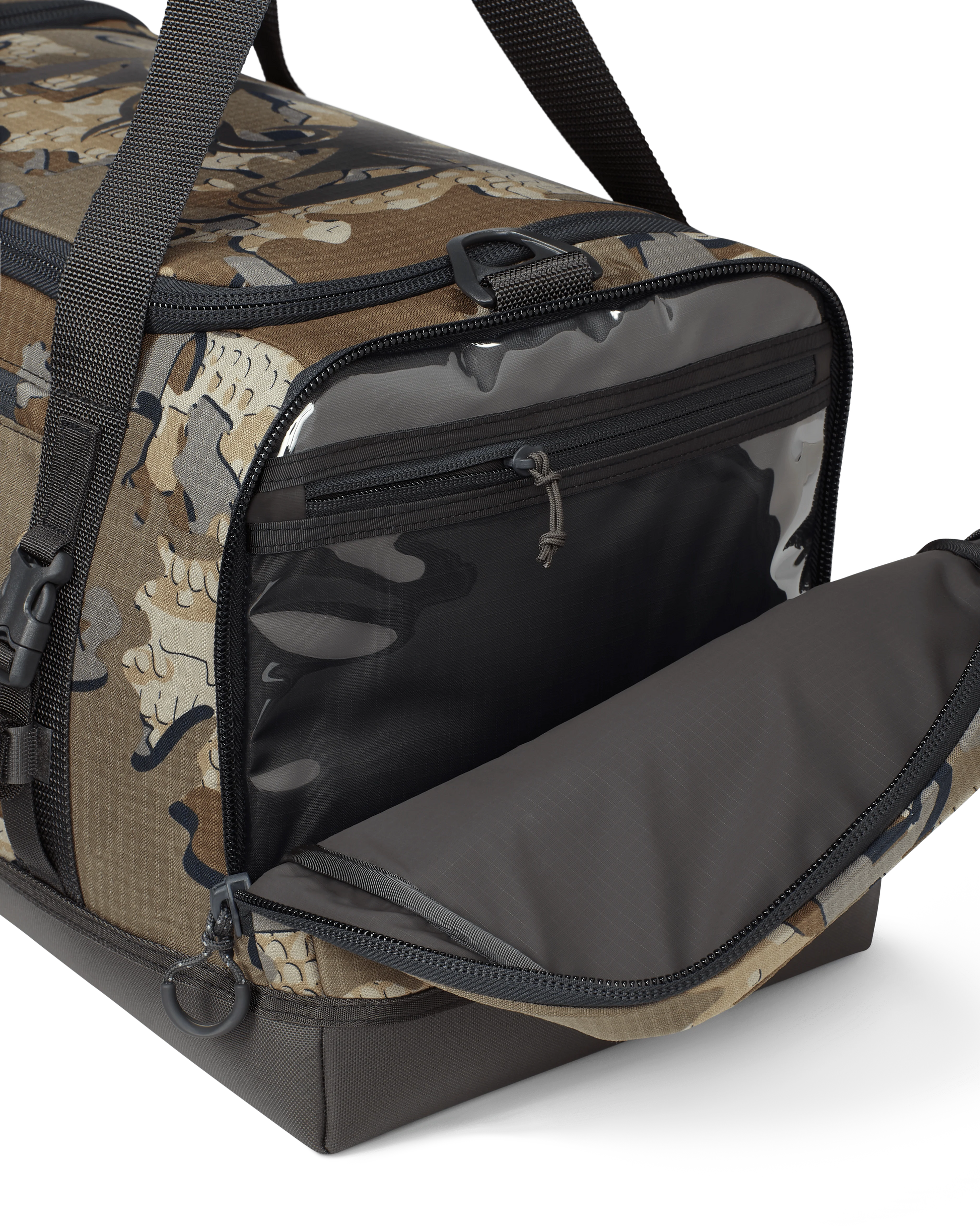 It features a structured bottom panel capable of hauling heavy ammo without collapsing, a fold –out, zippered lid with integrated storage compartments, a removeable internal tote, and external side pockets for smaller items. Additional features include padded grab handles, a removable shoulder strap, and external webbing loops with quick detach buckles for securing a tripod.