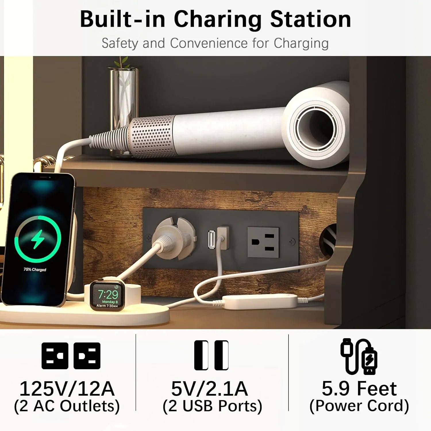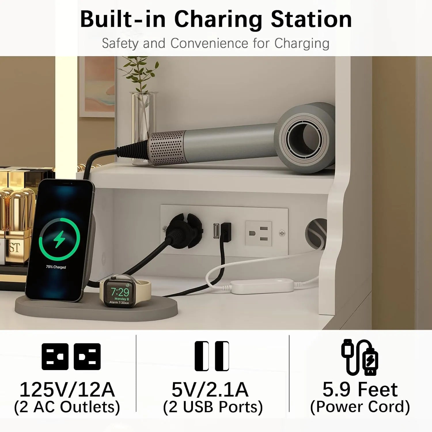 - 【Vanities Desk with LED Mirror and built-in power strip?: Vanities Desk with built-in power strip include 2 USB ports, 2 standard plug sockets,making it very convenient for you to charge your phone, headphones, use Hair dryer and other electronic. The LED mirror has 3 different color modes, while the brightness can be adjusted by touch button to meet different brightness needs.