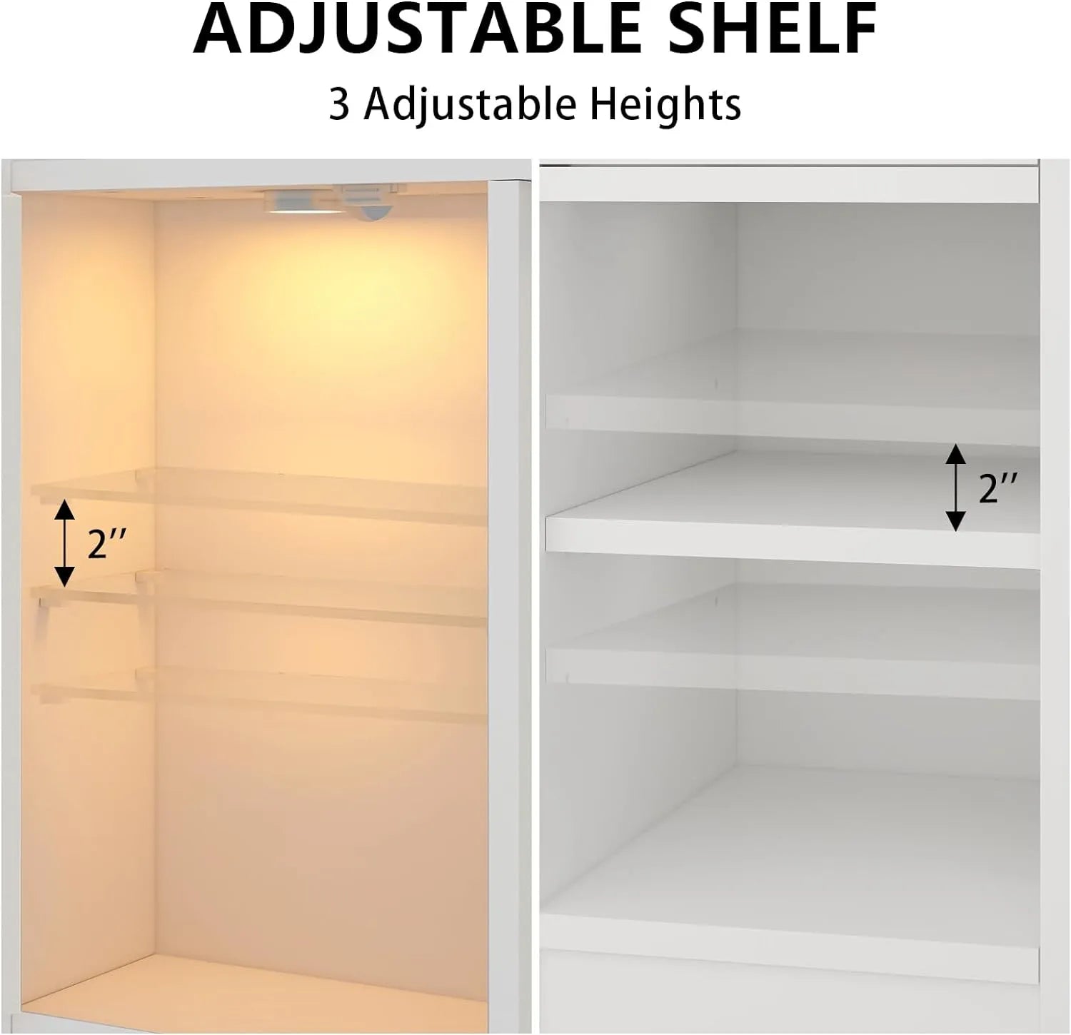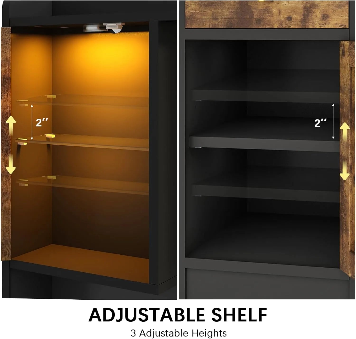 - 【Glass cabinet door with RGB lights】The Glass cabinet doors with RGB LED lights can be controlled by mobile app with a variety of colors and light modes to choose from. Music Sync mode makes your LED lights flash to the rhythm for an immersive home concert experience.