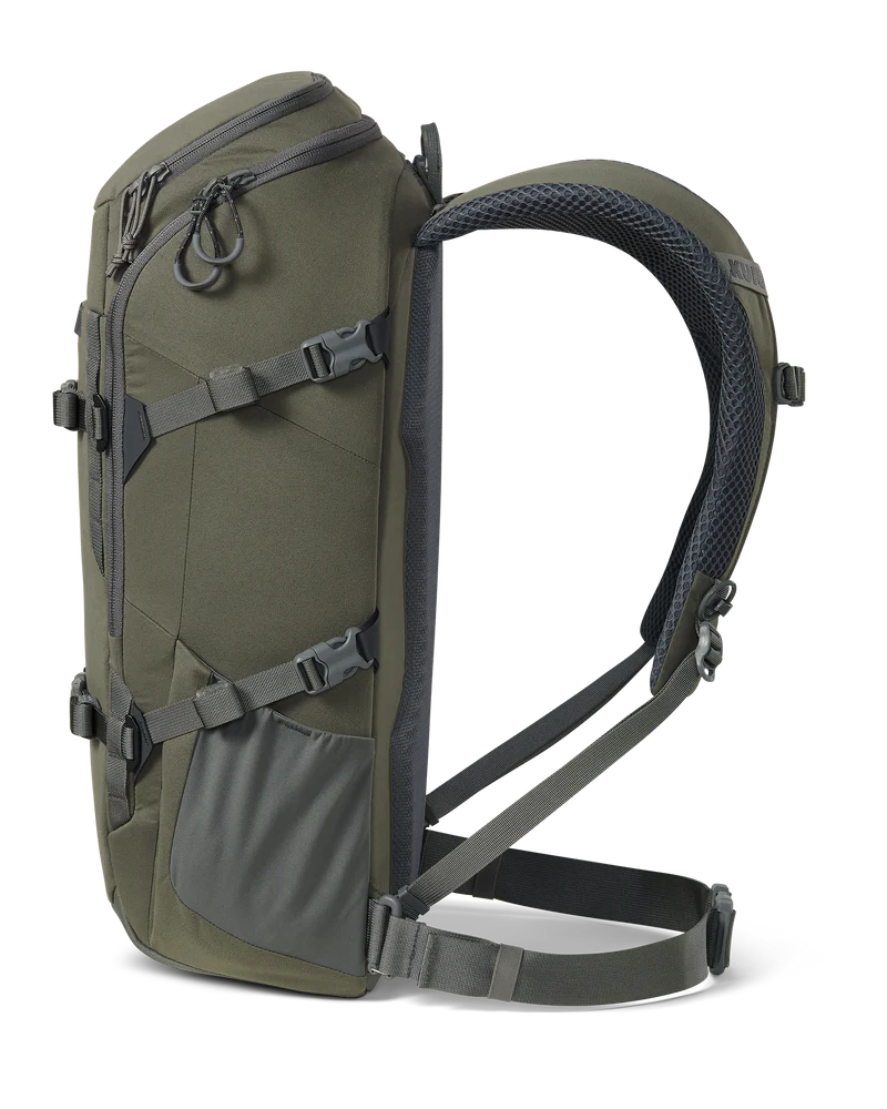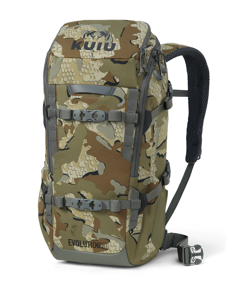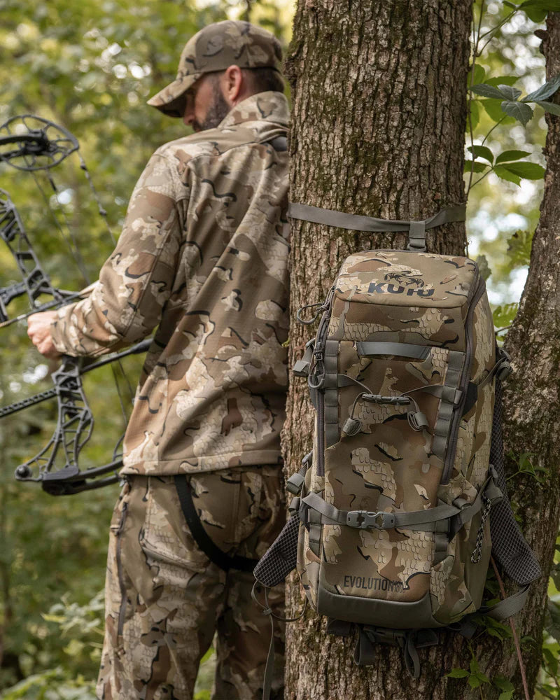The Evolution 1800 (1800 cu. in. / 29L) daypack, crafted for whitetail hunters, blends stealth and efficiency for stand or blind hunts. It organizes essentials—clothing, calls, food, and a 3L water reservoir—with dedicated pockets for easy access, including a fold down opening with locking sliders to give quick and silent access to your calls when in the stand.