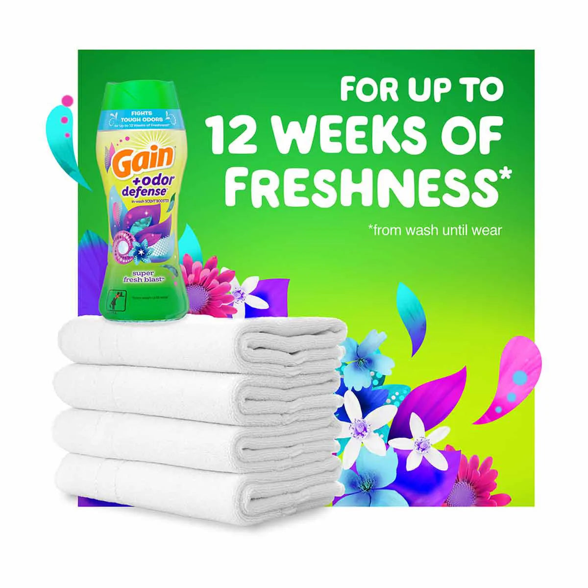 Pssst! Want to smell as fresh as you look? Leave tough odor behind by fighting it at the source instead of masking it, and get ready for up to 12 weeks of lasting freshness with Gain +Odor Defense In-Wash Scent Booster Super Fresh Blast Scent. Close your eyes and take your nose on a truly scent-sational adventure with the fresh aroma of nature that will make you believe you've gone on the best hike of your life. But watch out, it's so irresistible, you might never want to come back.Pair it with other Gain + Odor Defense Super Fresh Blast products for a truly irresistible experience. from wash until wear