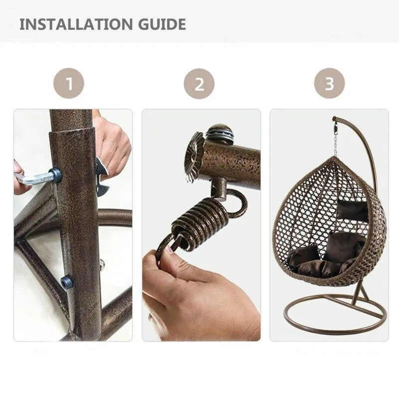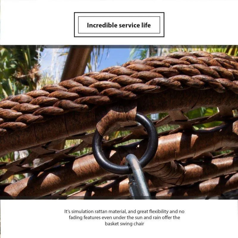 - Material, wicker plastic, steel frame, cotton mat, easy assemble. Built from thick brown meshed wicker, this chair will have you cradled and hanging in comfort as you enjoy the refreshing breeze of the great outdoors. From summer lounging to stretching out with a good book, this hanging basket chair will have you relaxing with ease.