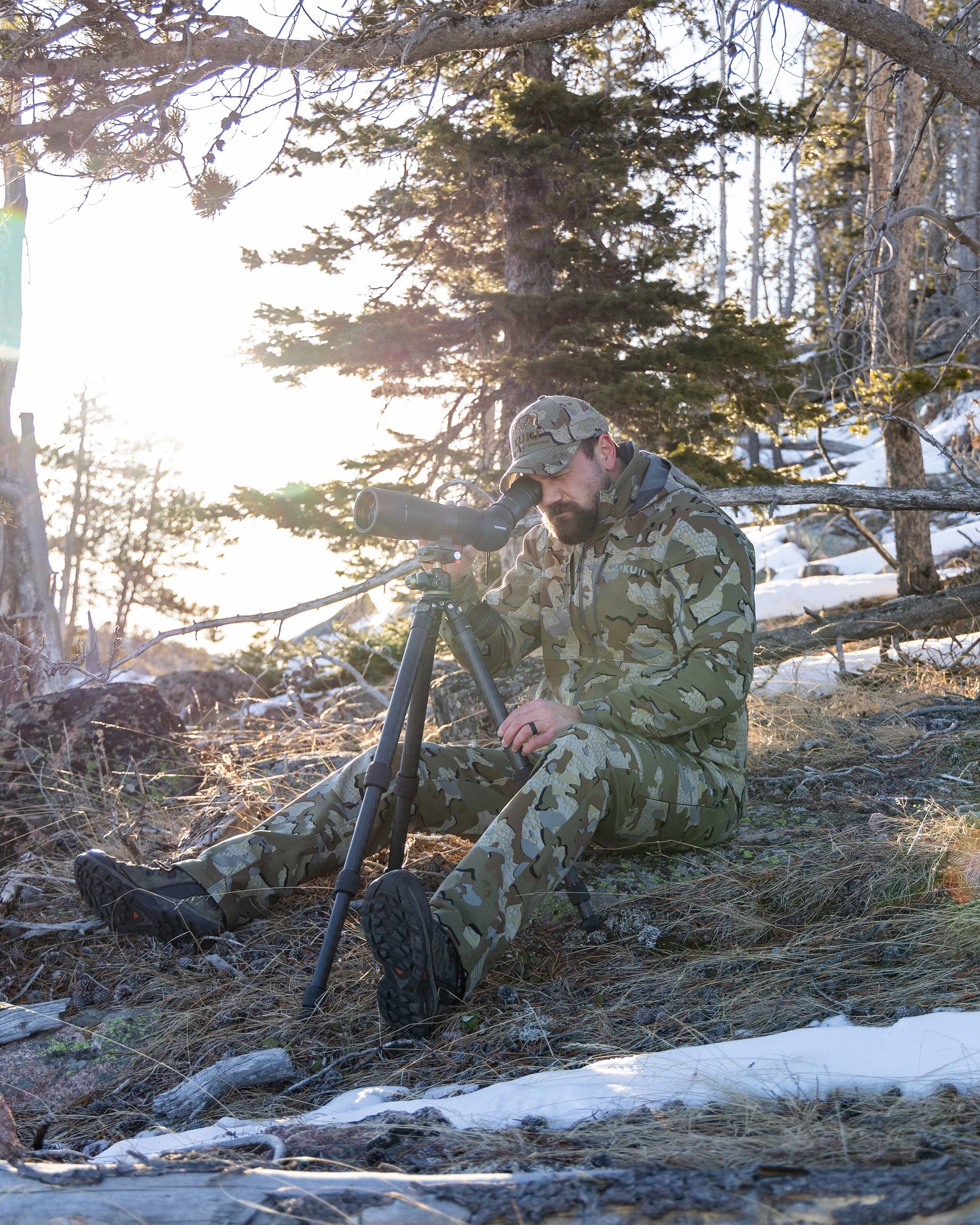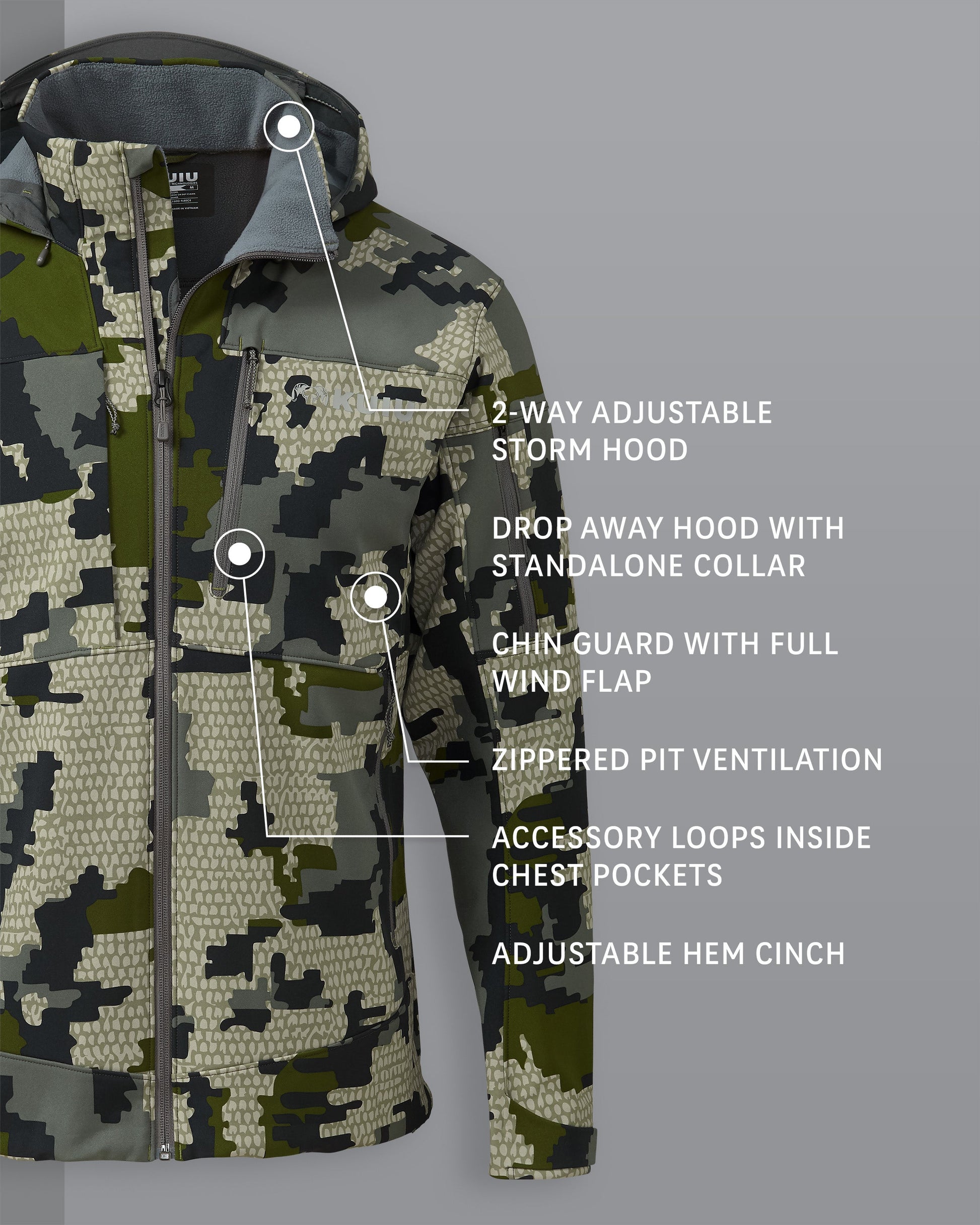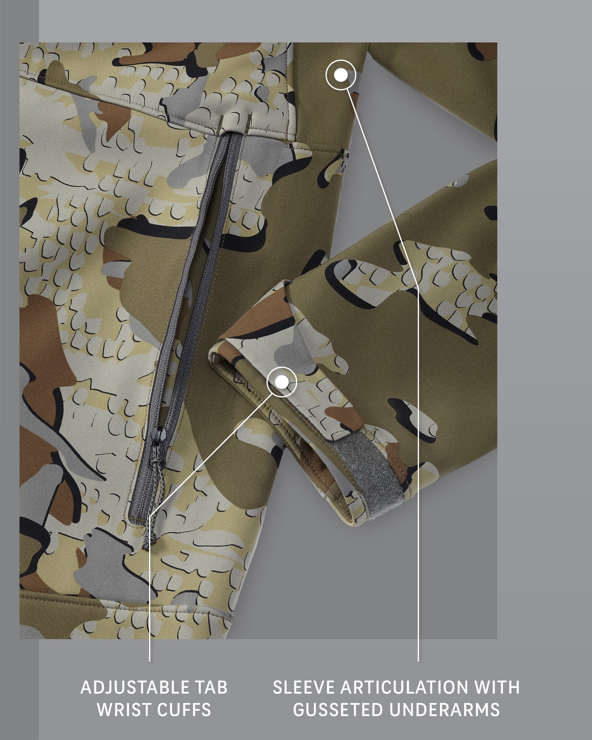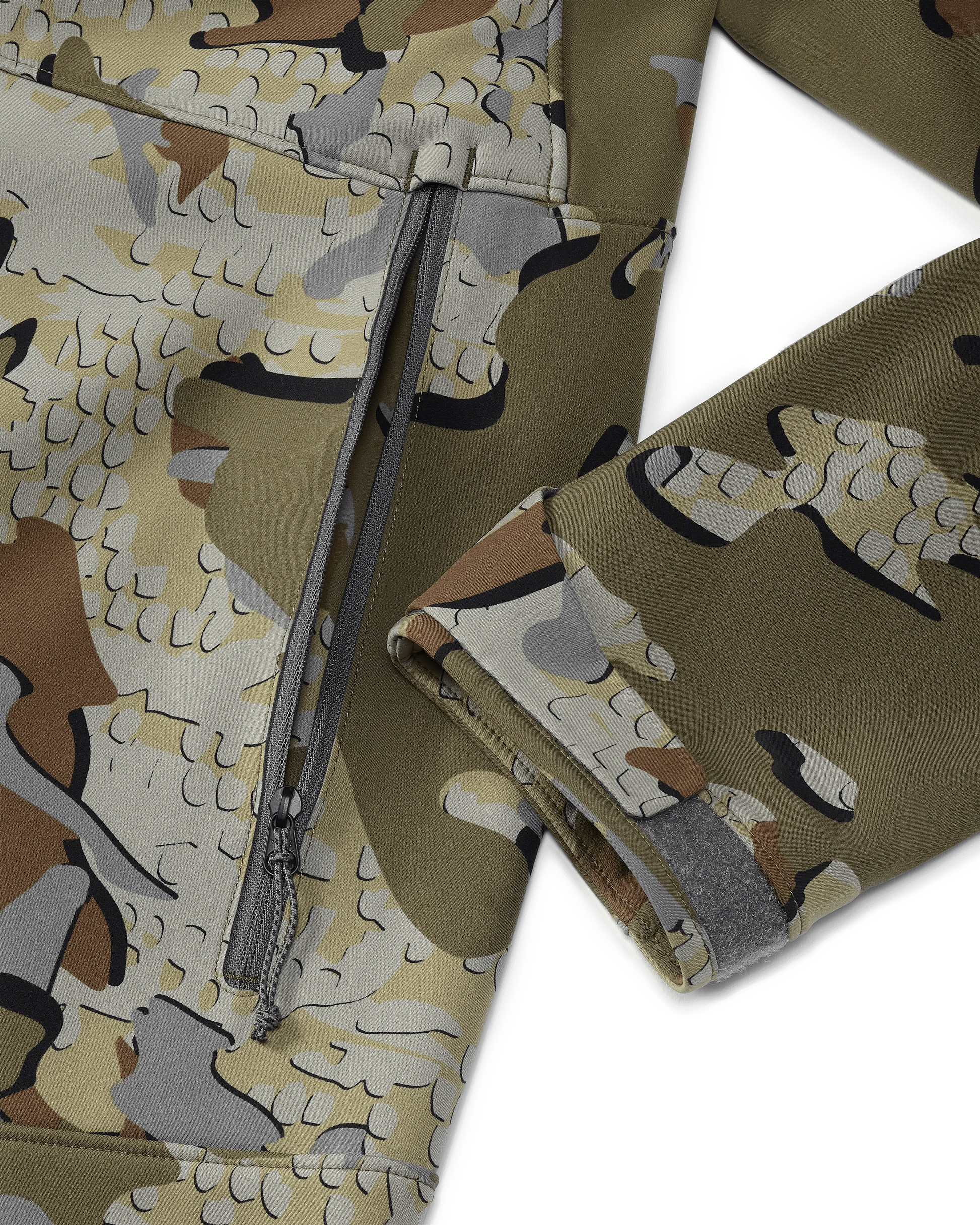 With the mountain hunter in mind, we optimized and fine-tuned every feature, including dual chest pockets with an added accessory lanyard connection point, zippered pit vents for thermoregulation, and a two-way adjustable storm hood that can be cinched back on either side and worn up while shooting. In addition, an adjustable hem cinch blocks out wind, and raised hand pockets stay accessible while wearing a pack.