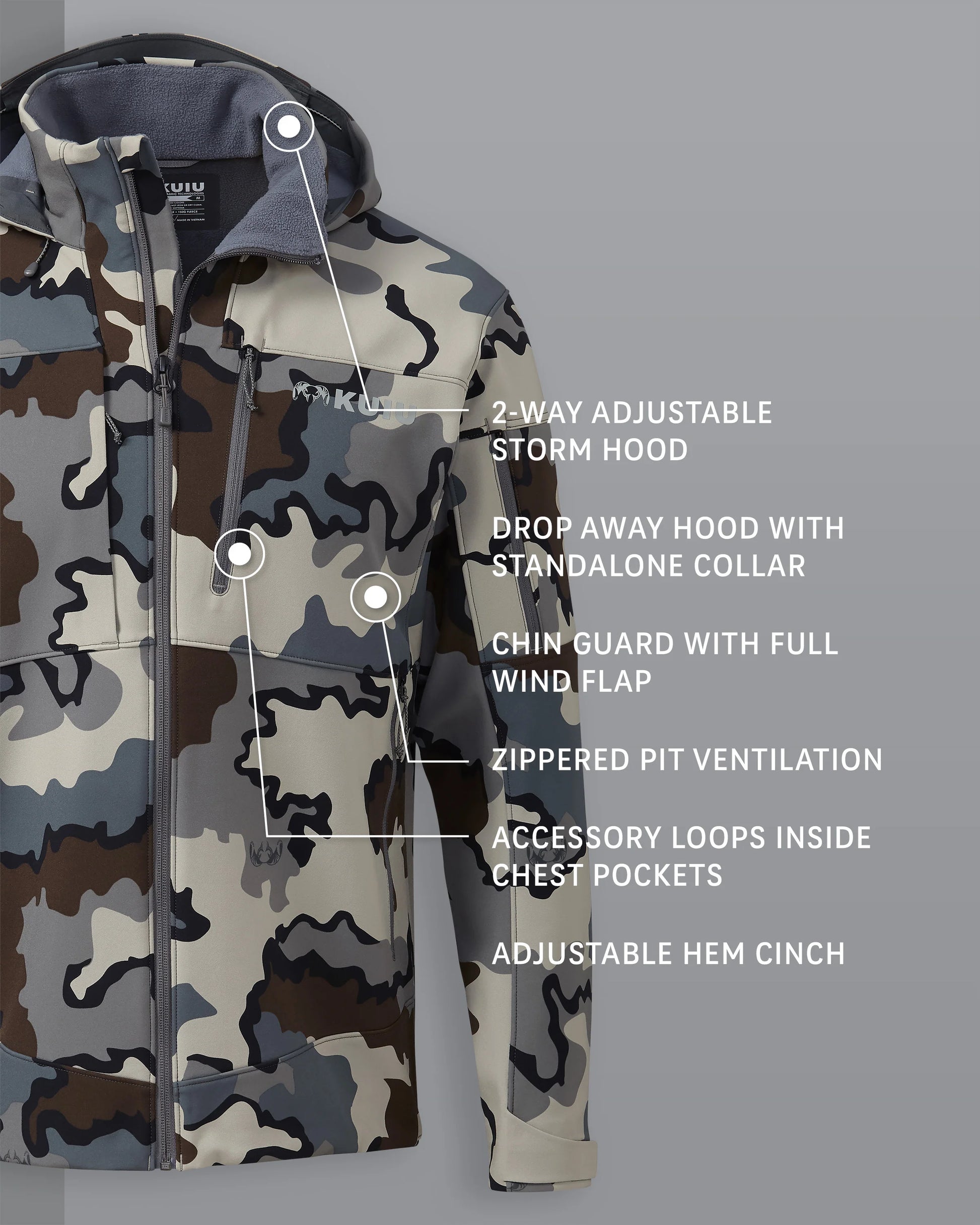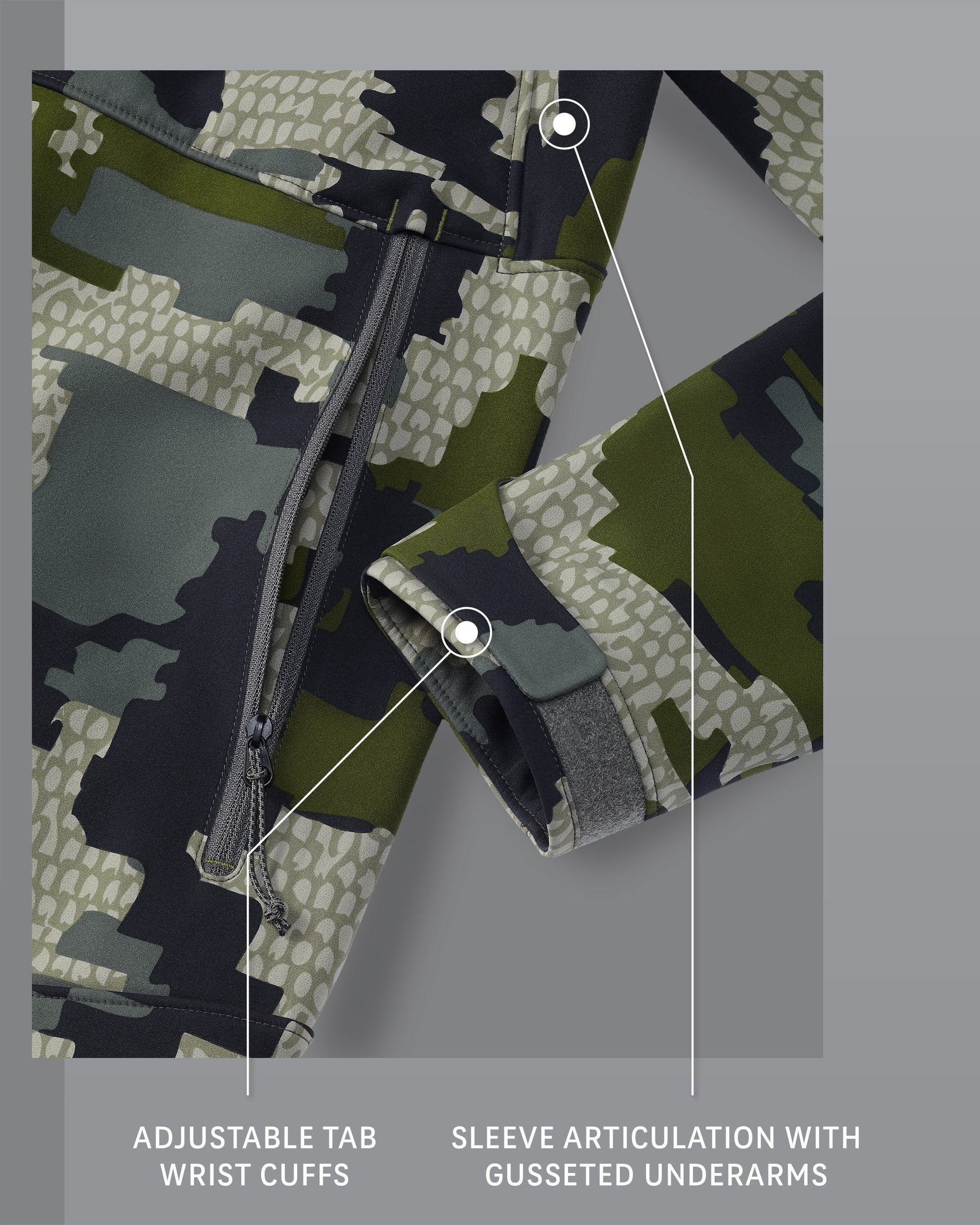 Designed for mountain hunting, the Guide PRO is ideal for colder conditions when heavily insulated layers and 100% waterproof protection are not necessary. Leveraging K-DWR® durable water repellency, combined with Primeflex® quick-drying fabric, it withstands light rain and snow in conditions most would opt for hardshell rain gear.