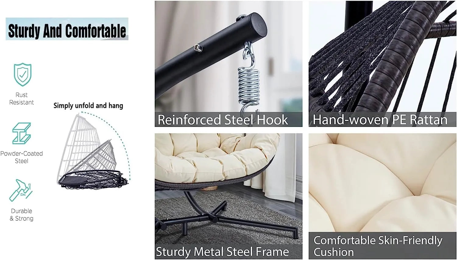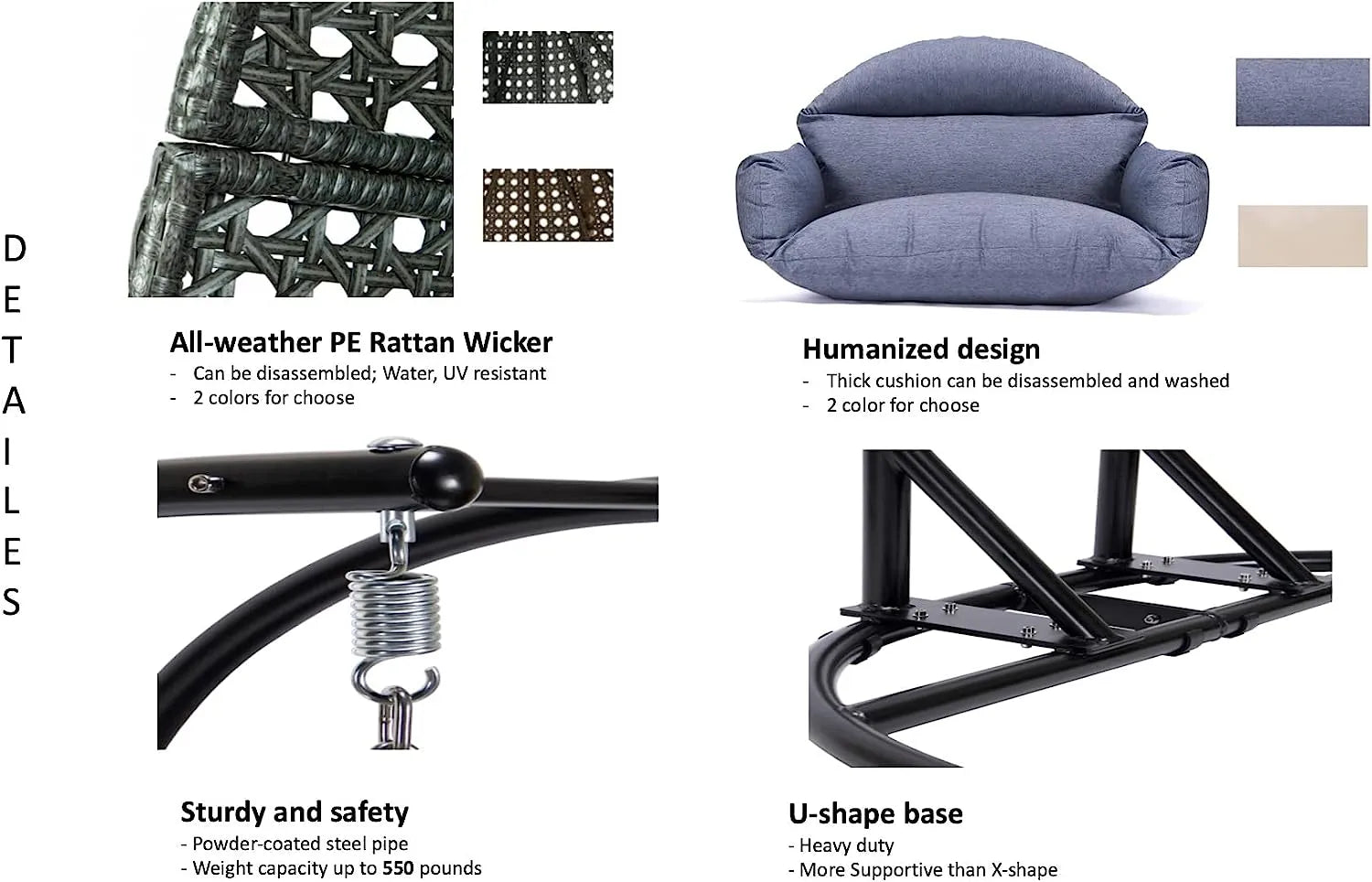 - 【Sturdy Swinging Chair】The two seater egg hanging chair is constructed by 10 metal keels and UV protected polyethylene rattan resin wicker, supported by powder-coated steel stand, assembled by 304 stainless steel accessories, This functional hammock chair is simple yet tasteful, easily matches the style of any bedroom, patio, backyard, and more!