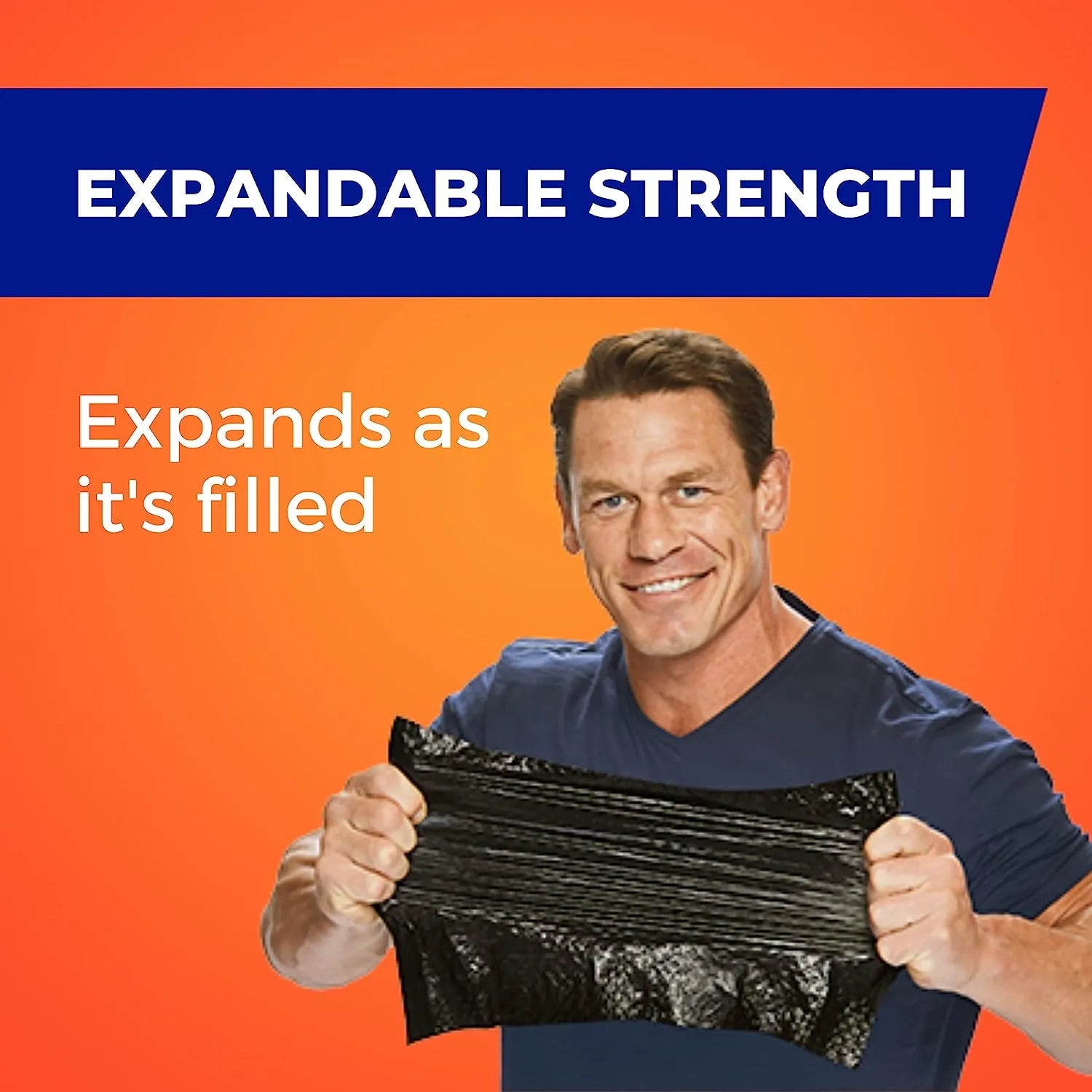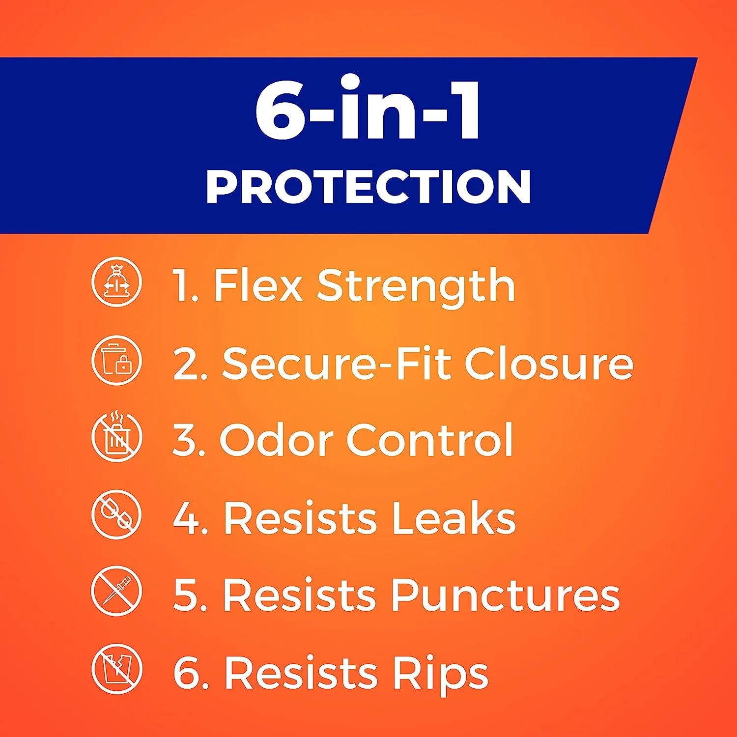 - TRIPLE-ACTION TECHNOLOGY—These kitchen garbage bags, stretch and expand to accommodate oversized loads without punctures, leaks or tears