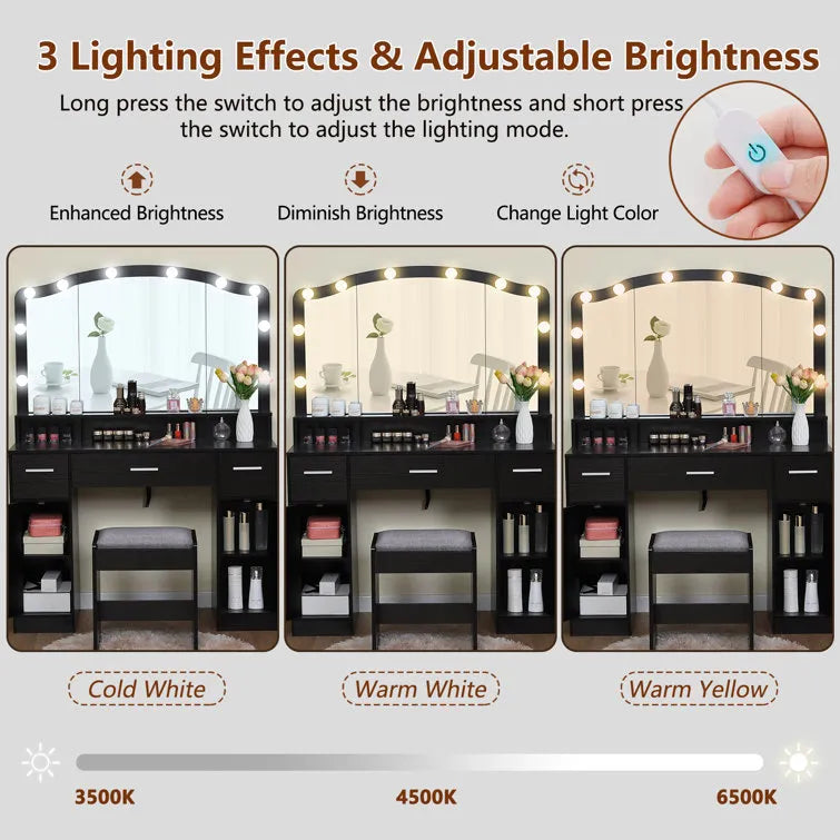 - Makeup vanity with lighted mirror: The large mirror of the vanity set offers a full view, 10 Hollywood light bulbs are very bright. The vanity table with a large mirror will be a good assistant when you make up and make your makeup more beautiful.