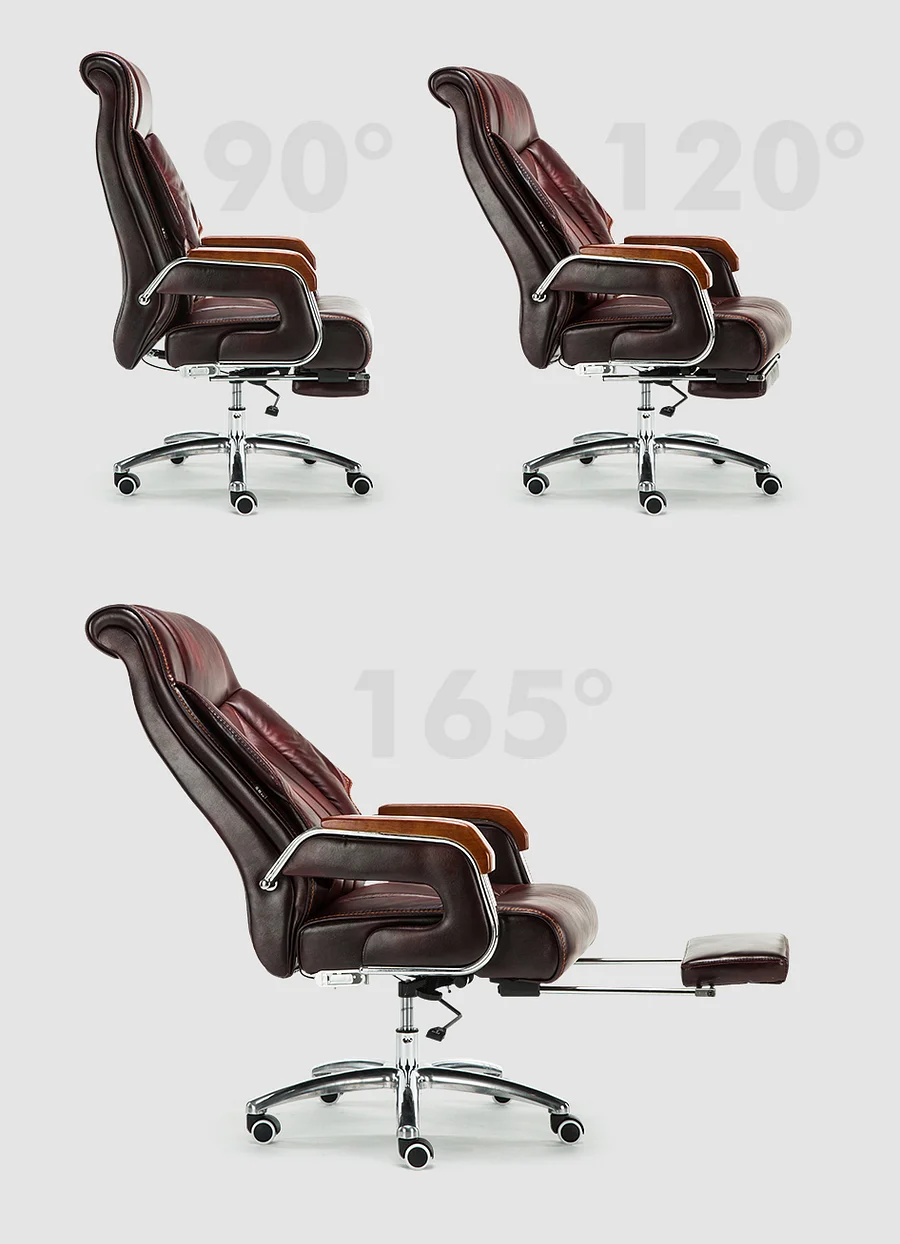 "Experience exceptional comfort and support with the Mid-Century modern executive office chair. With soft, regenerated leather upholstery and hand-sculpted wooden arms, this ergonomic chair tastefully complements your office decor. Its large, tall design allows you to sit comfortably for extended periods of time, while memory foam cushions and a contoured lumbar panel provide targeted support where you need it most. Easy one-touch levers let you adjust the height, tilt and lift the chair. "