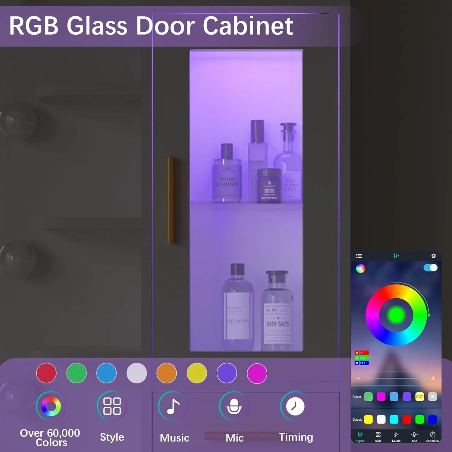 - 【Vanity Desk with RGB LED Light】This vanity is equipped with a cabinet with height-adjustable laminates and an RGB lighting system, which can be controlled via APP or a switch. With over 60,000 static colors available and multiple lighting modes, the system can synchronize to music for a stunning visual experience while you relax or entertain.