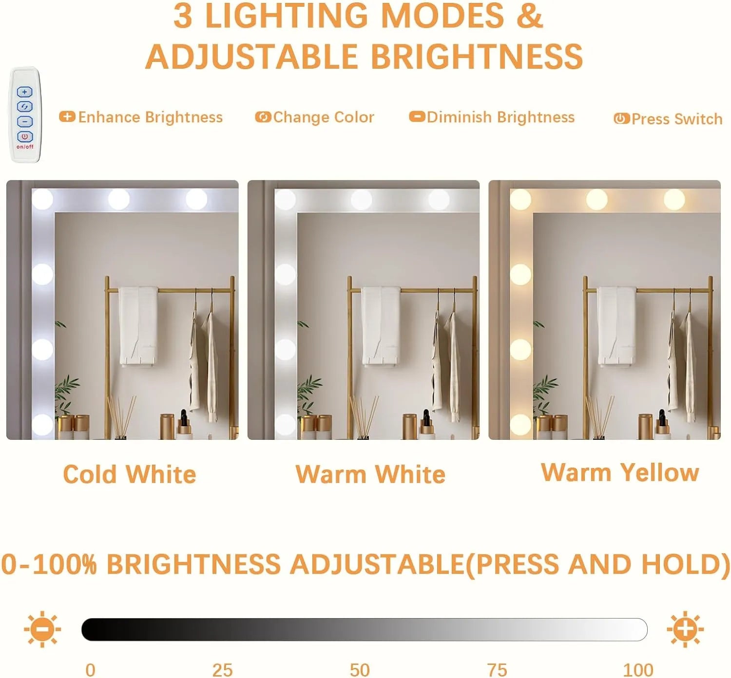- ? Lighting Modes & Brightness Adjustable】The vanity desk is equipped with a large mirror and 10 LED light bulbs, offering 3 color modes (warm yellow, warm white, and cool white) to provide a soft, eye-friendly light source. By simply pressing the switch, you can easily change the color mode or adjust the brightness to your liking.
