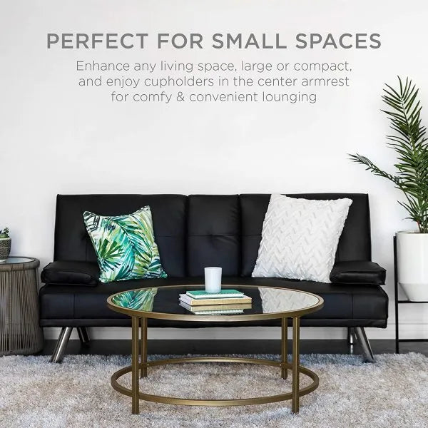 - ROOM FOR 2: This stylish futon sofa has a 500-pound weight limit that lets you lounge in good company while utilizing a fold-down armrest with convenient cupholders in the middle