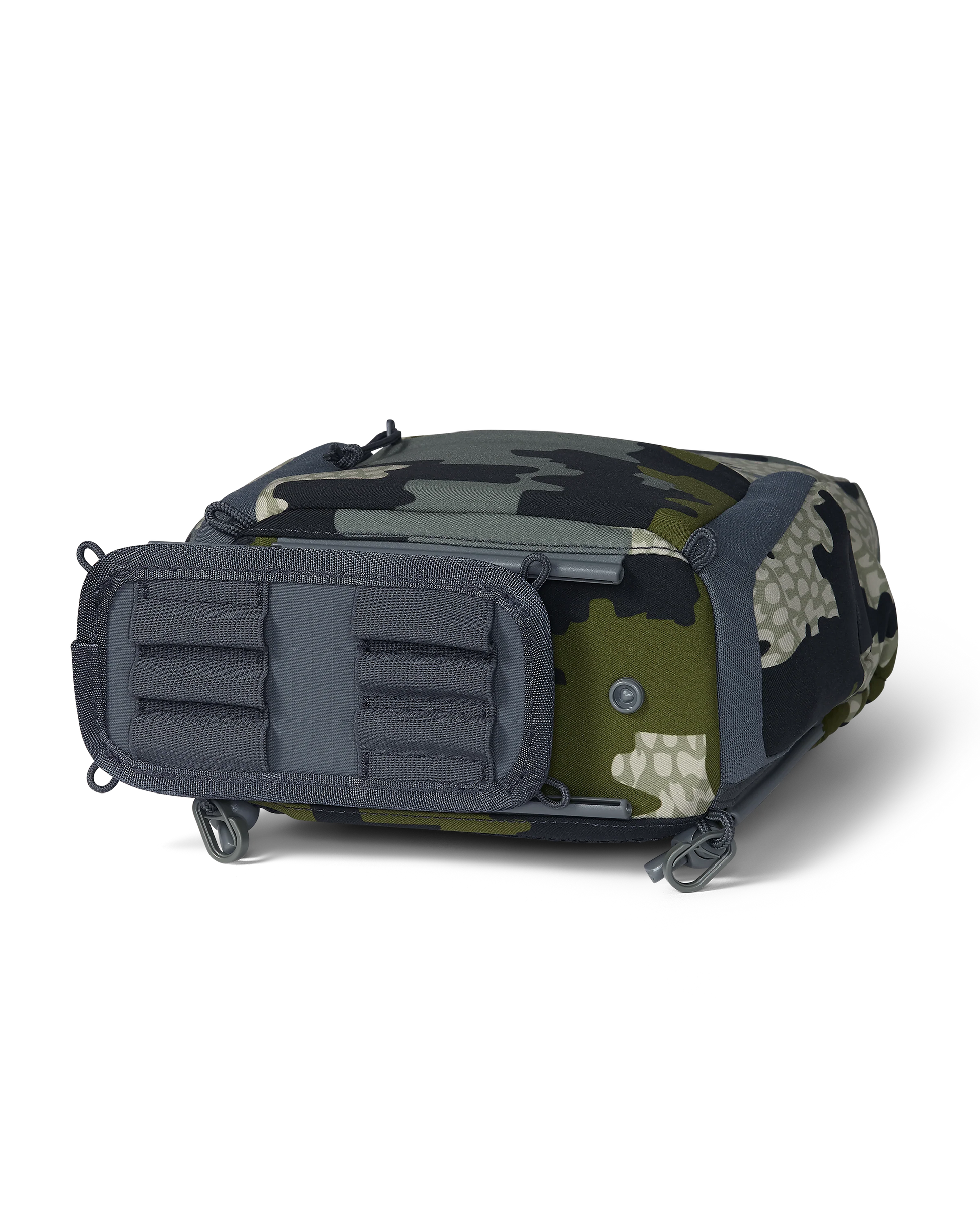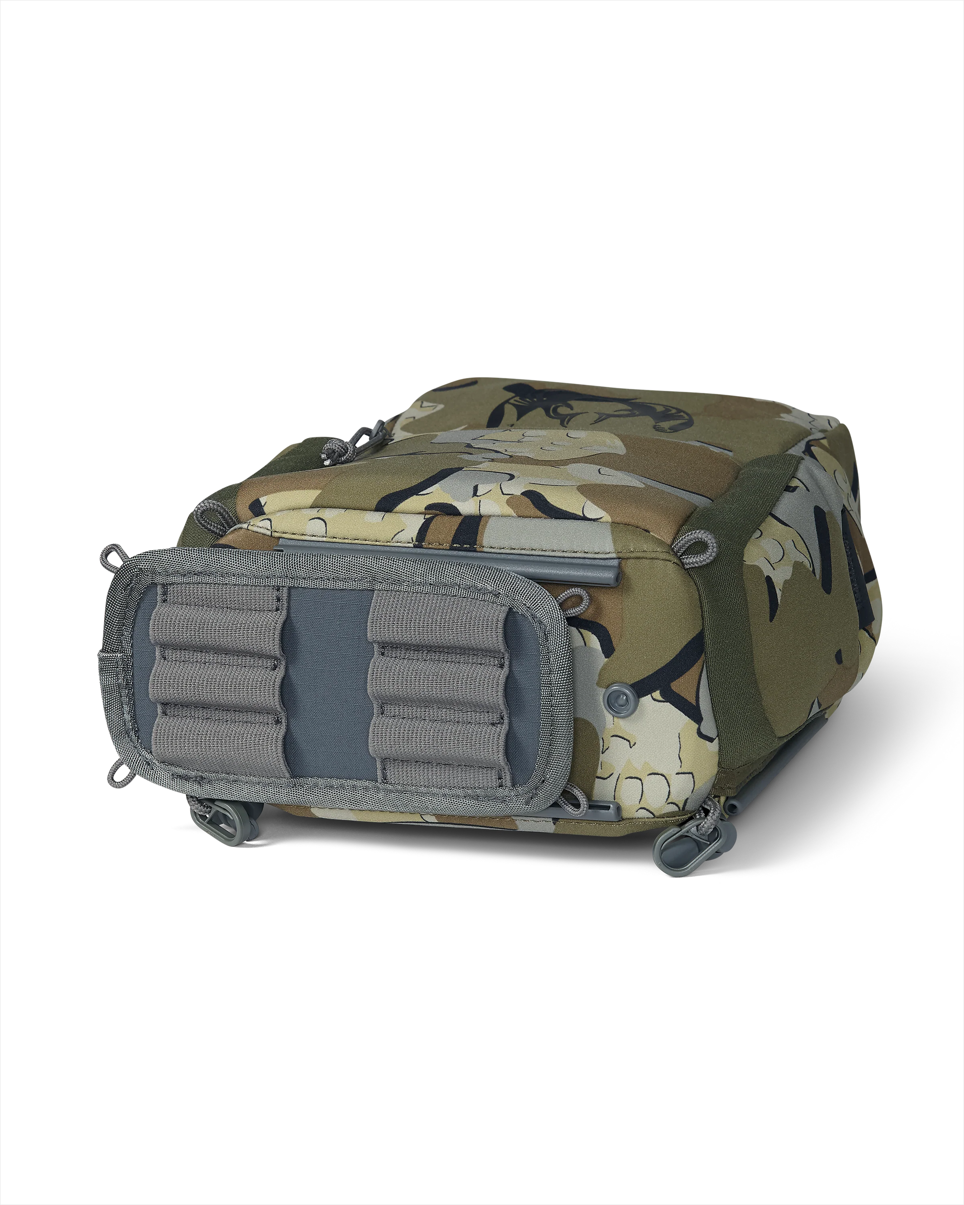 At the heart of the system, the structured pouch with forward folding lid is built from an ultra-quiet, fleece-lined softshell fabric, with a waterproof/dustproof membrane. The fully enclosed design and protective material keeps your optics clear from moisture, dust, and debris while remaining quiet and easily accessible.