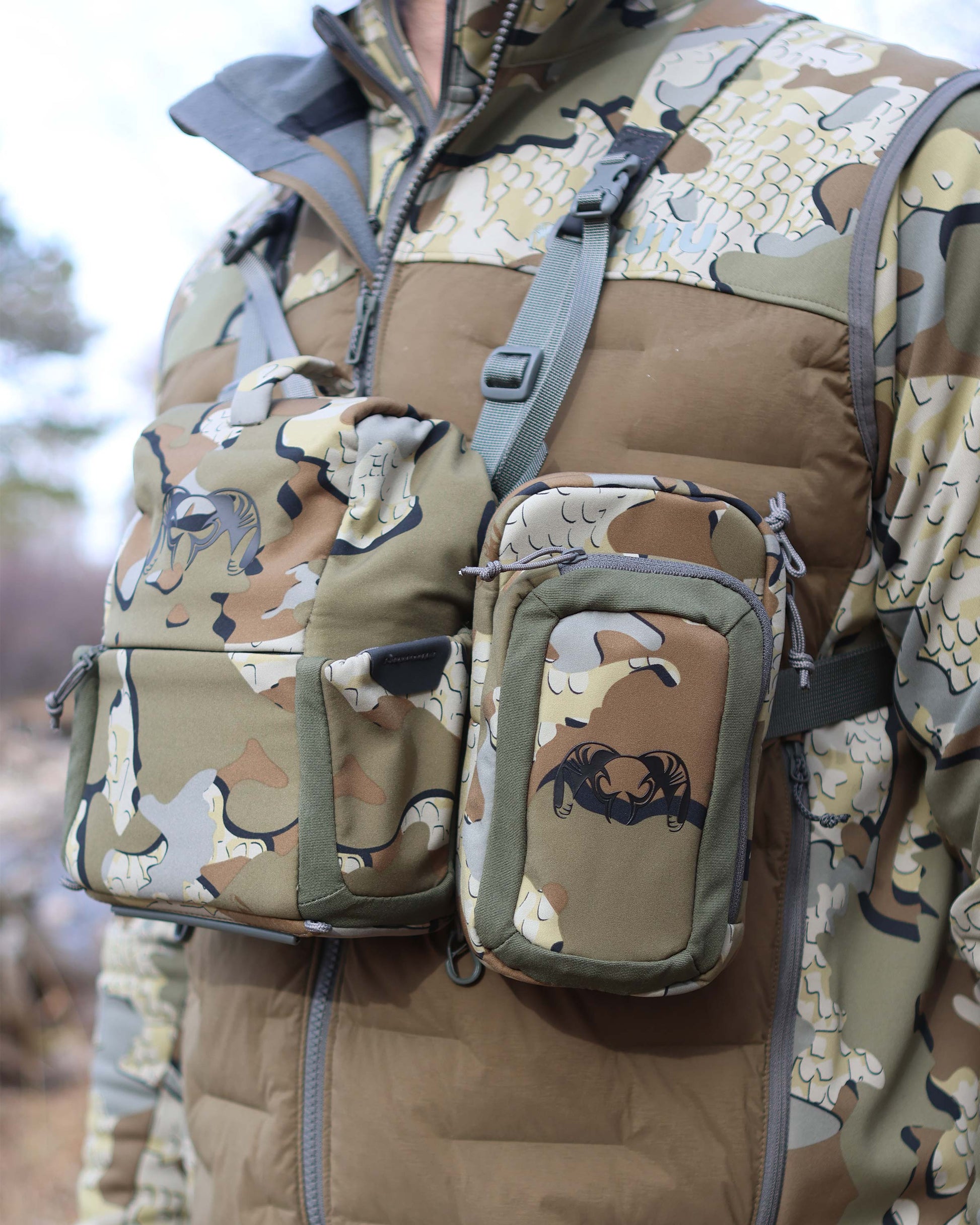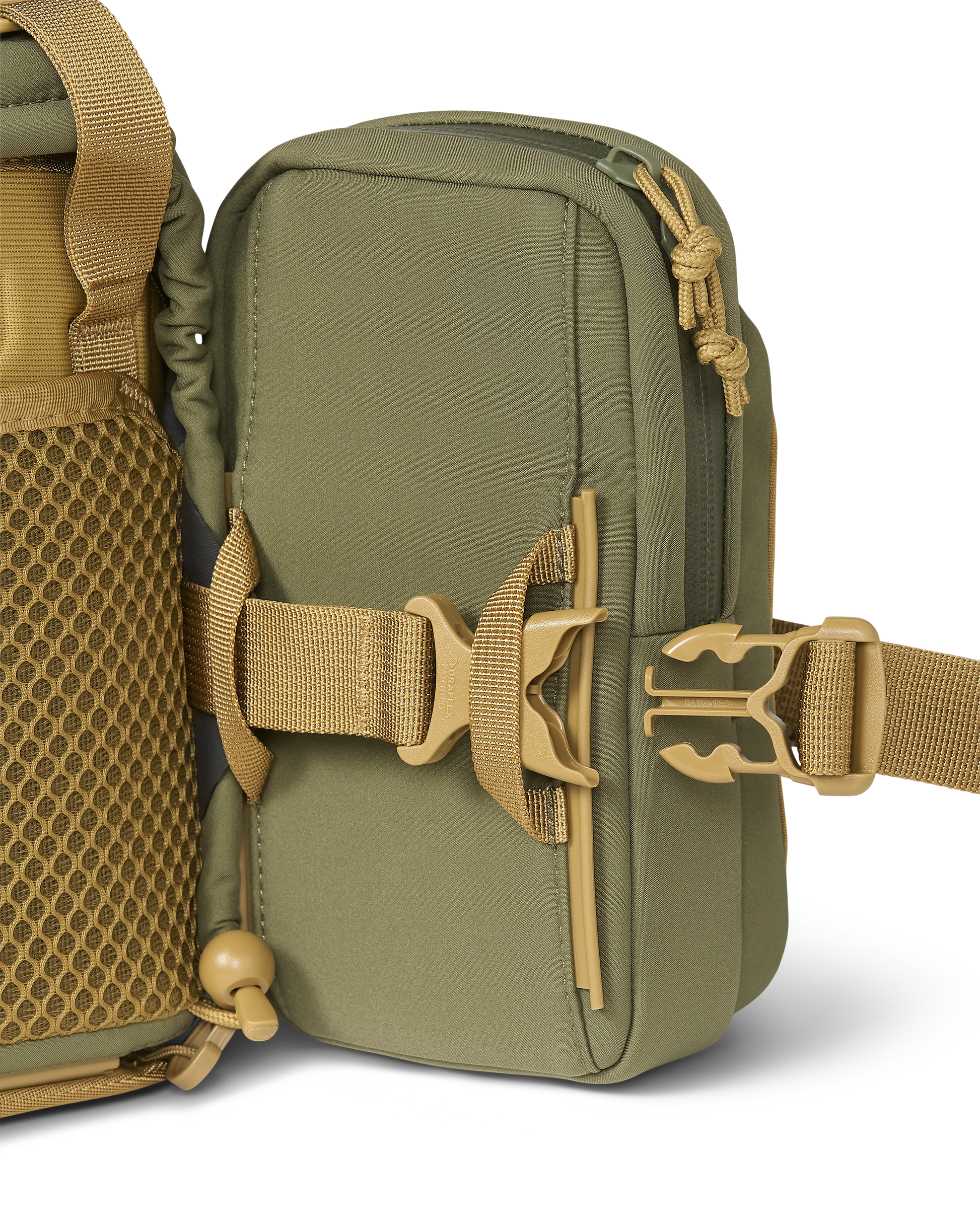 The outer pocket stows and organizes your tethered rangefinder scope adapters, lens caps, and accessories, but may be used as storage for a compact rangefinder instead. Accessory loops located on both sides of the case provide a secure clip-in location for our Rangefinder Lanyard. Utilizing secure Rail-Lock connection system and webbing loops, the PRO G3 Phone Holder easily attaches to either side of the PRO G3 Bino Harness.