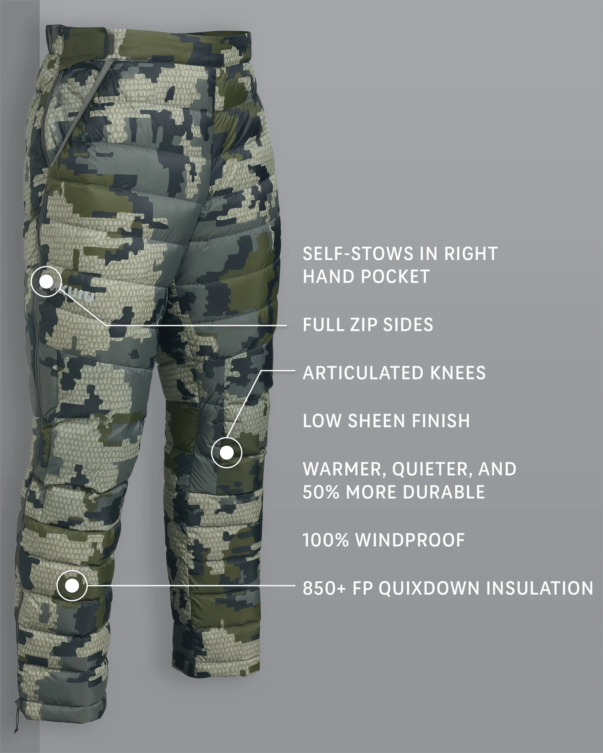 The Super Down LT Pant is sized with a versatile mid-layer fit, to comfortably layer over a base layer or hunting pant, yet trim enough to layer under our rain gear in the same size. The pant features full-length side zippers so you can put them on or take them off while standing, and without removing your boots.