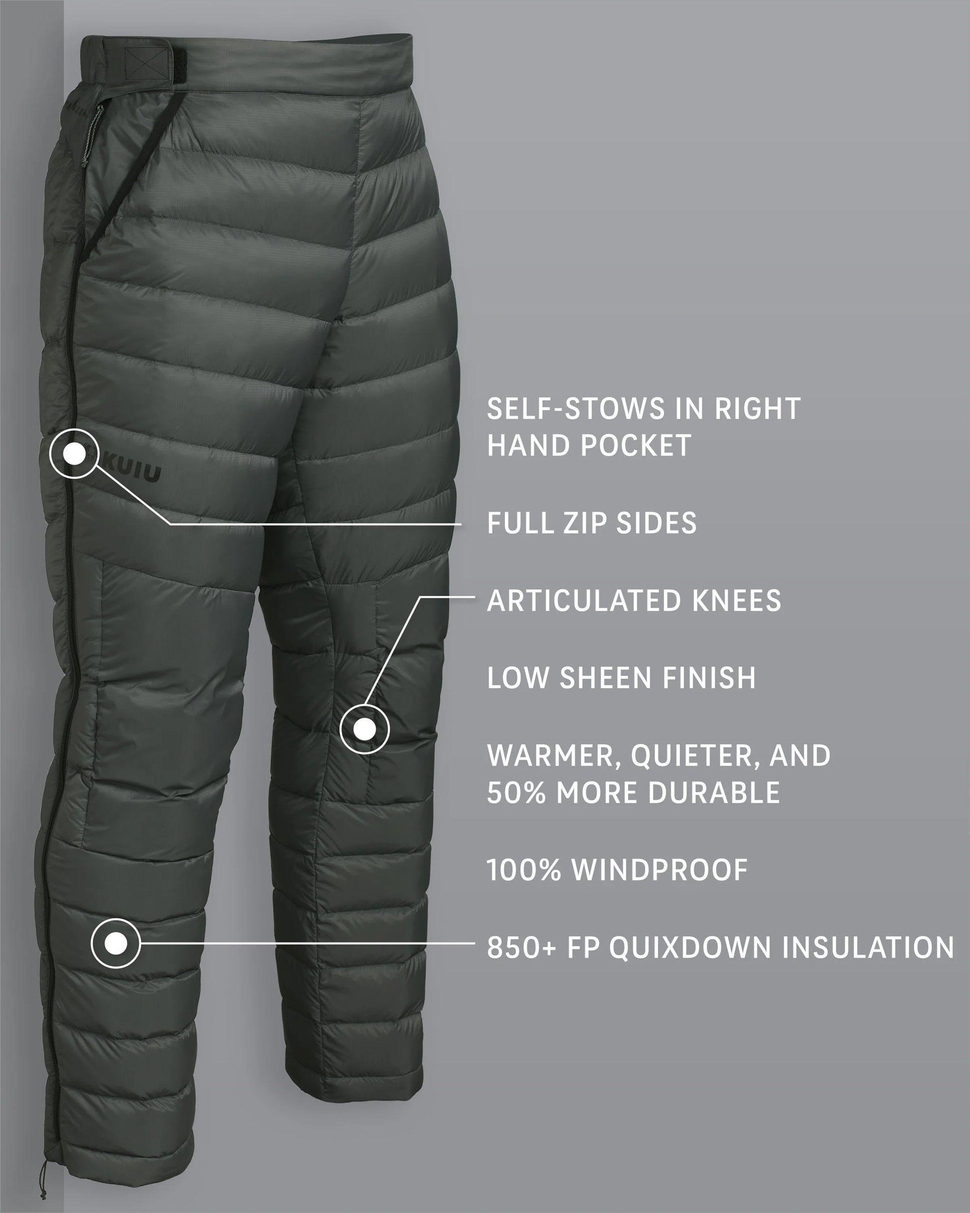 The Super Down LT combines our legendary Quixdown insulation with an all-new durable, matte face fabric, and updated styling for a significant update over our previous designs. The fabric is lighter, quieter, and more packable, while both the durability and tear strength increased by 50%. The redesigned baffle structure increases loft and warmth throughout the pant, while the fit is improved for standalone wear and layering.