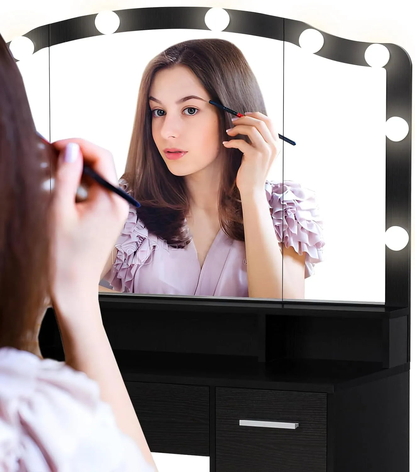 - 💄【Vanity Set with Super Large Mirror】With USIKEY full size large lighted mirror makeup vanity( Mirror Size: 39.4"L*22.4"W), you will no longer need to move your body from side to side to search for the best makeup angle like in the past! Fine selection of high-definition makeup mirror, easier to view your makeup details, whether prepping for a new day in the early morning or gearing up for a dinner date, you'll be perfectly perched this vanity with large mirror