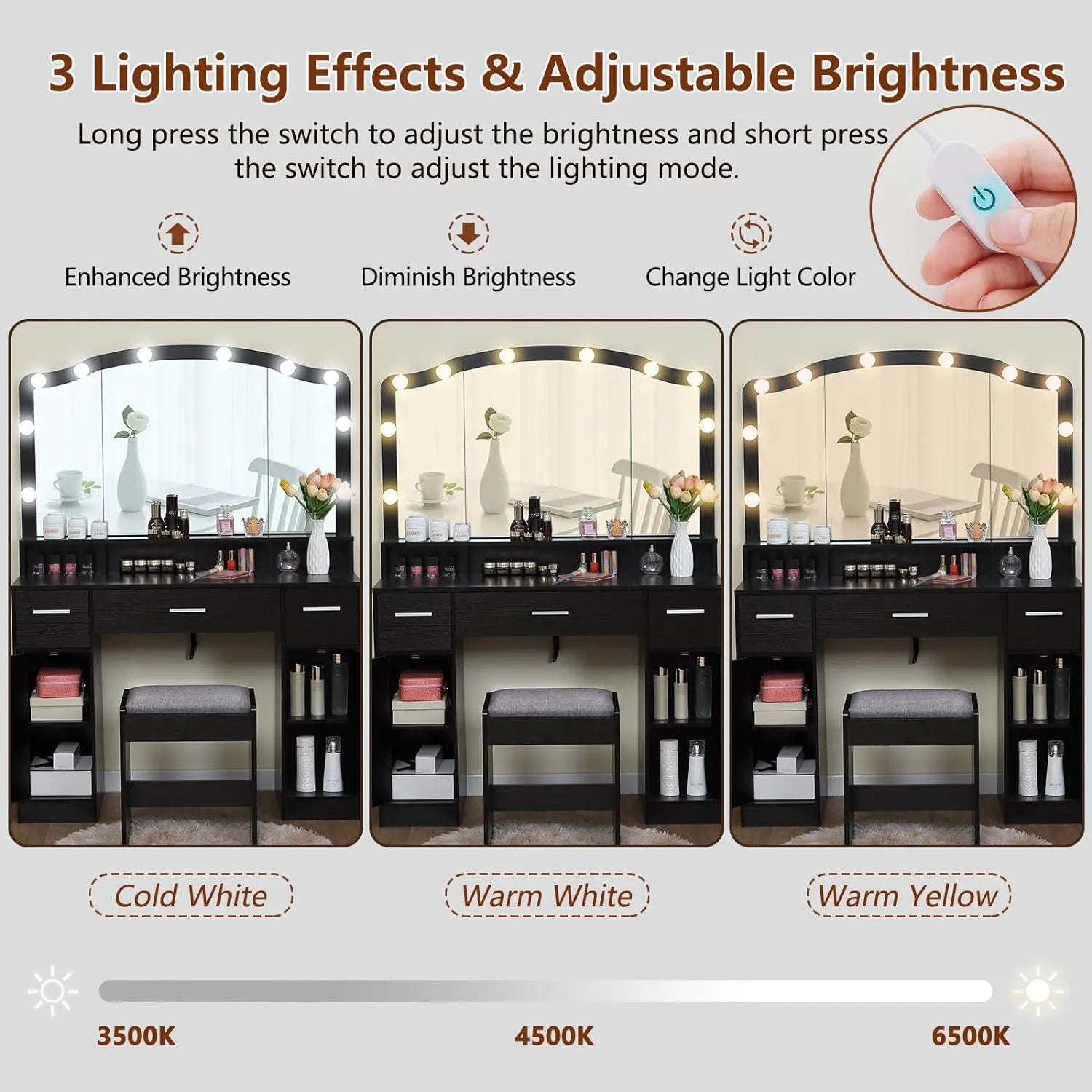 Makeup Vanity with 3-Color Lighting Modes & Brightness Adjustable