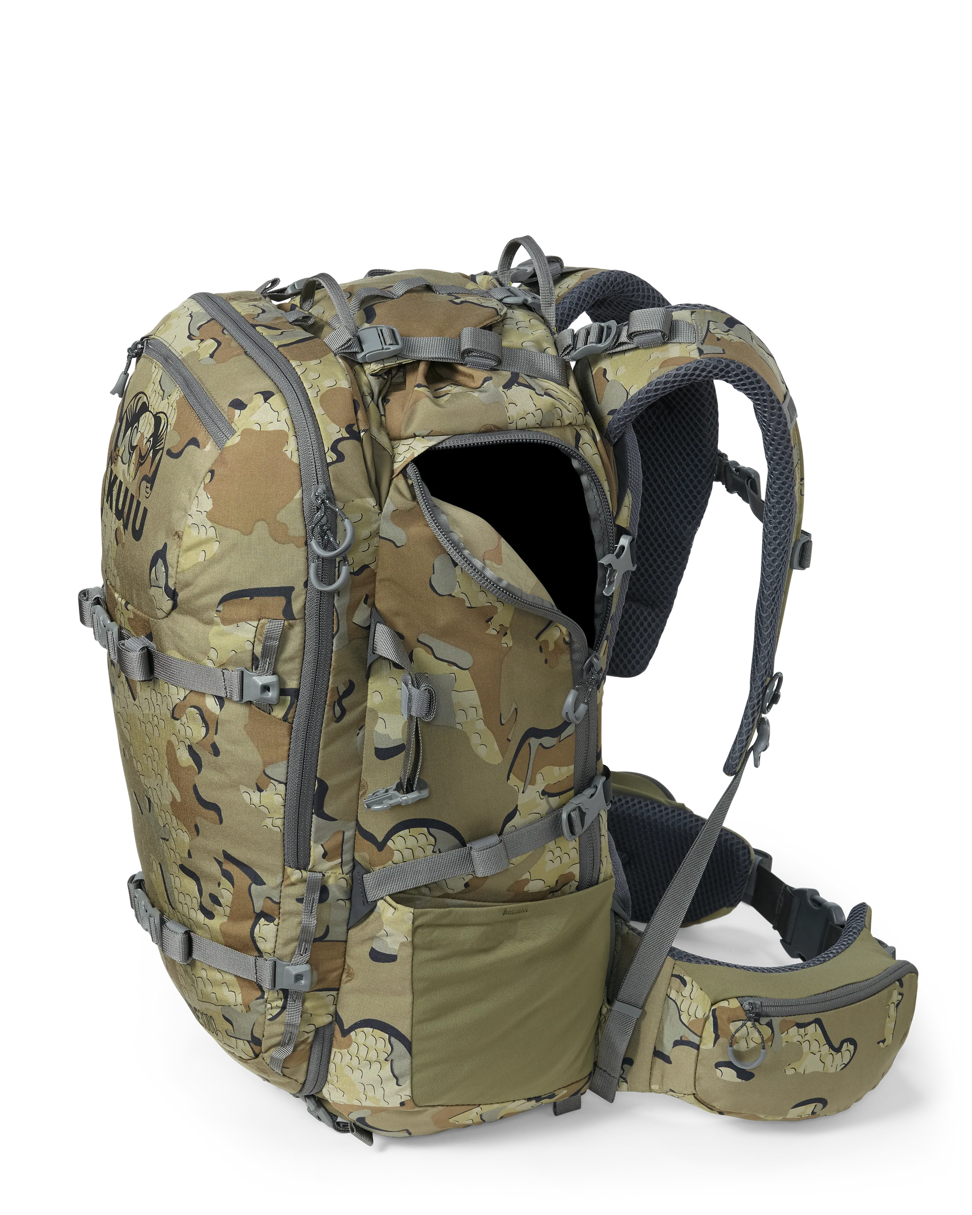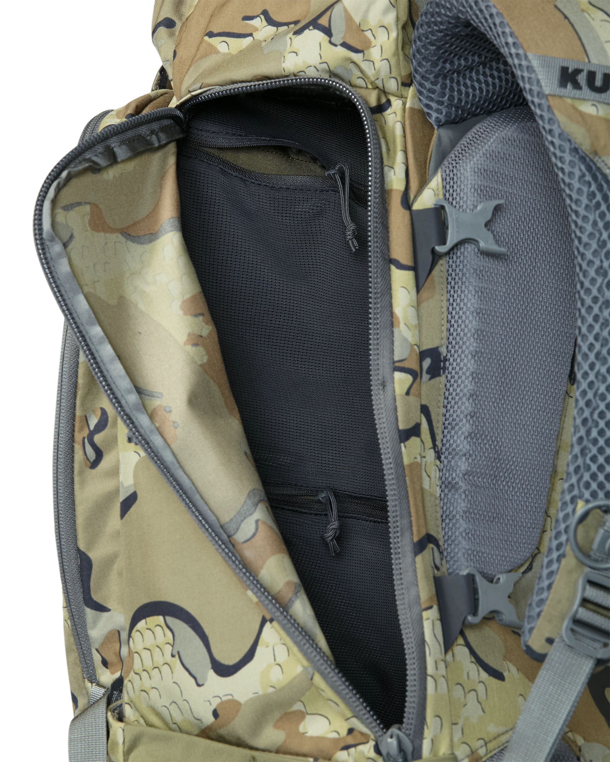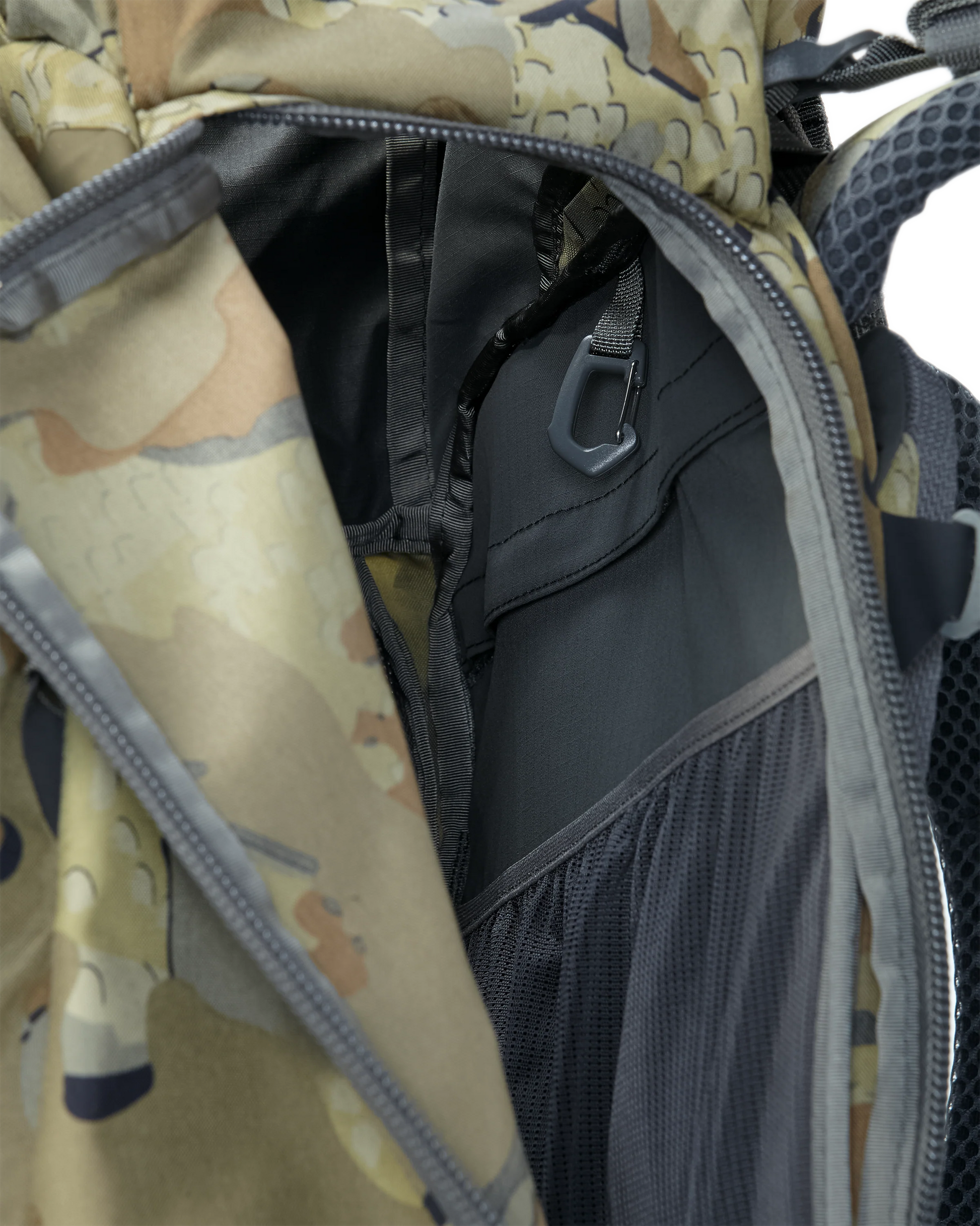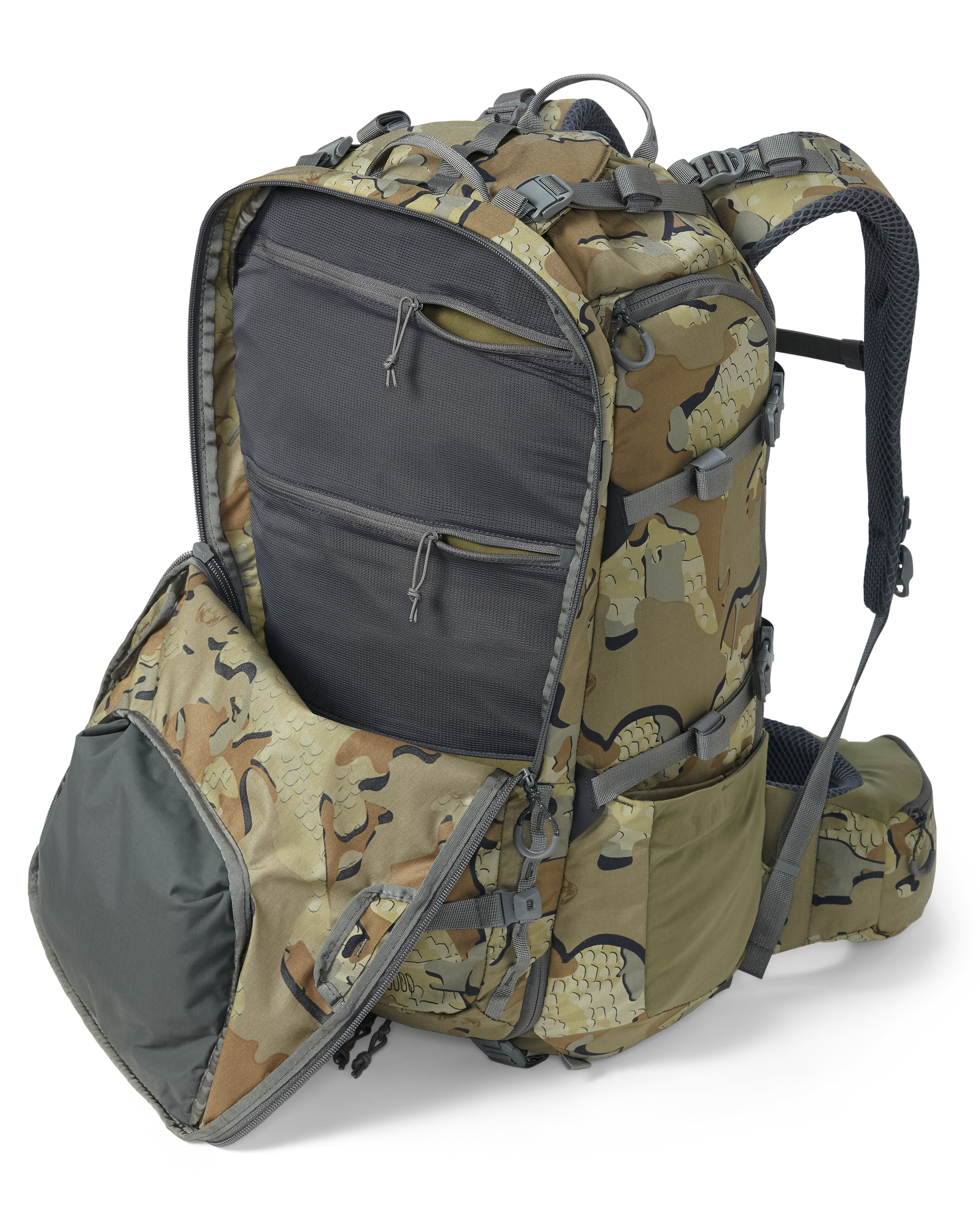 The main compartment is accessed through the side zipper or through the top shroud closure. The top shroud with dual cinch closures expands for extended capacity, keeping gear separate, or hauling taller items like a hind quarter.