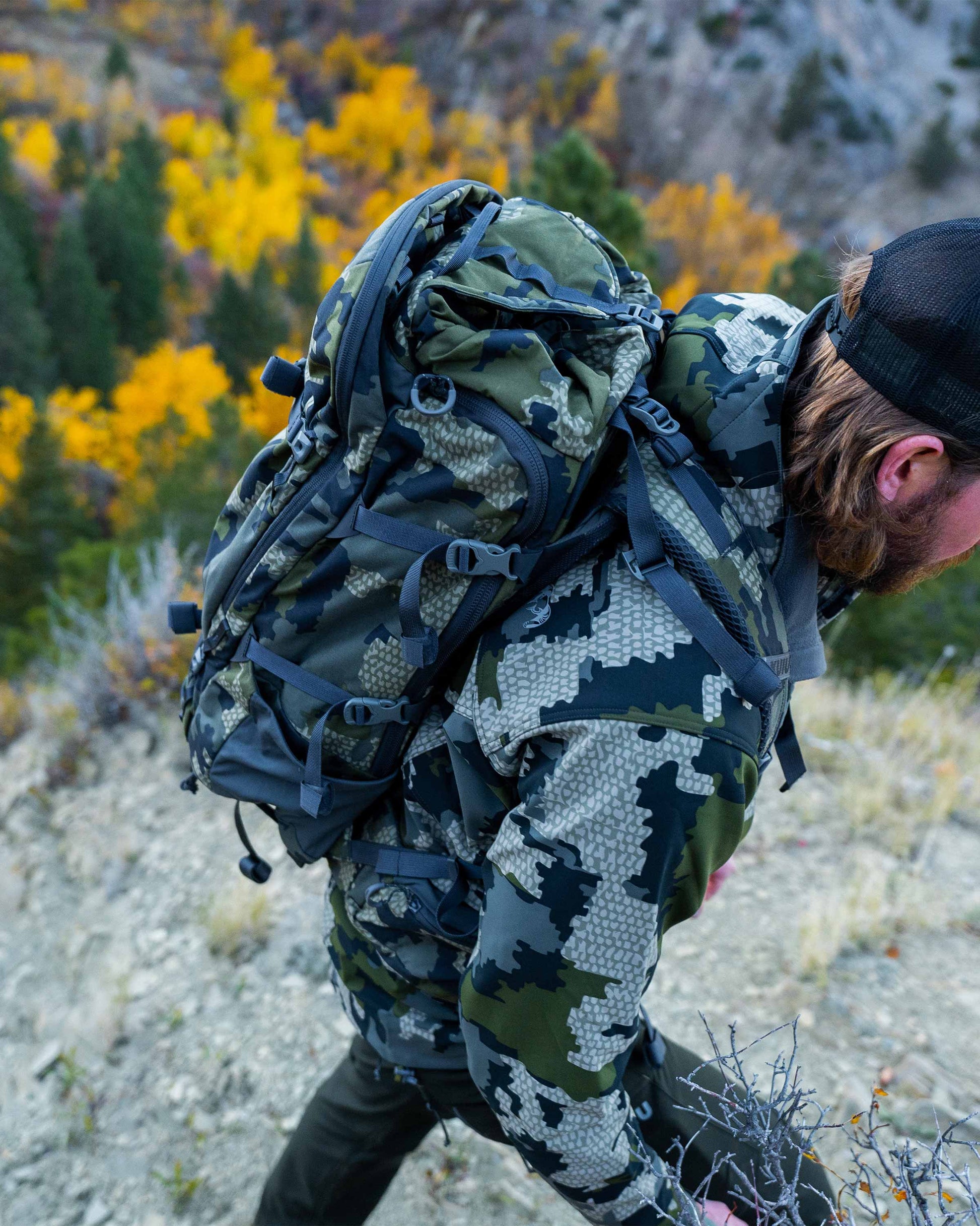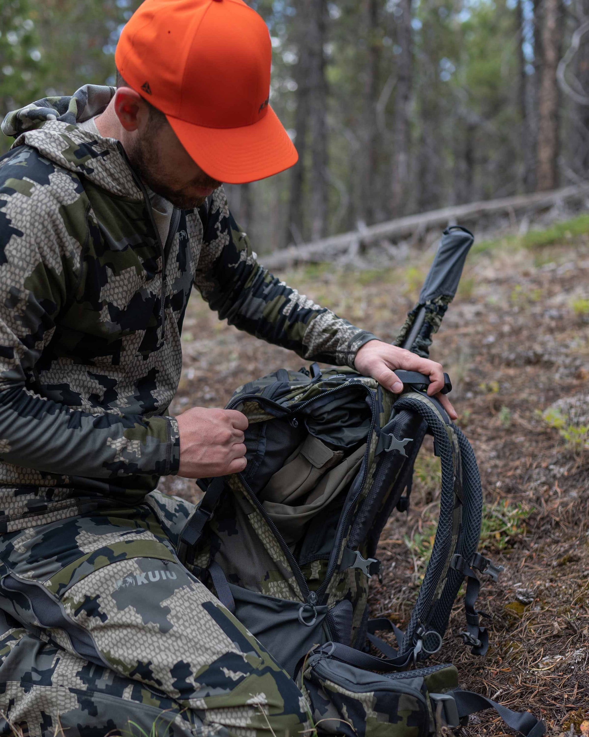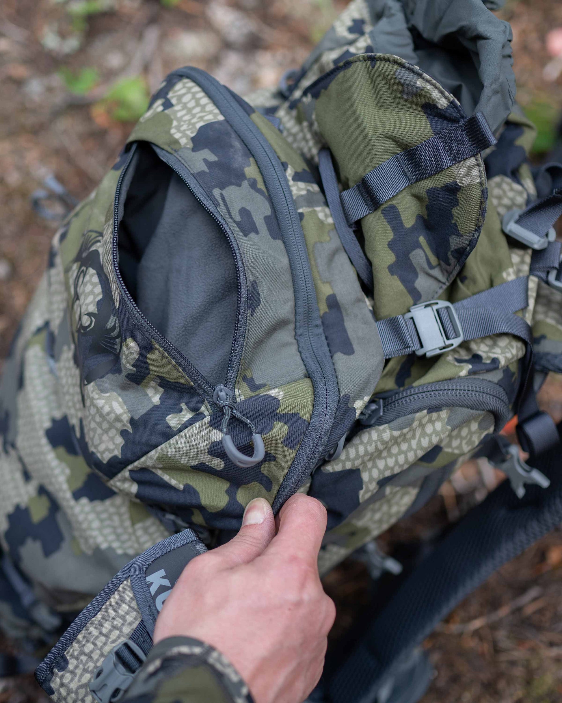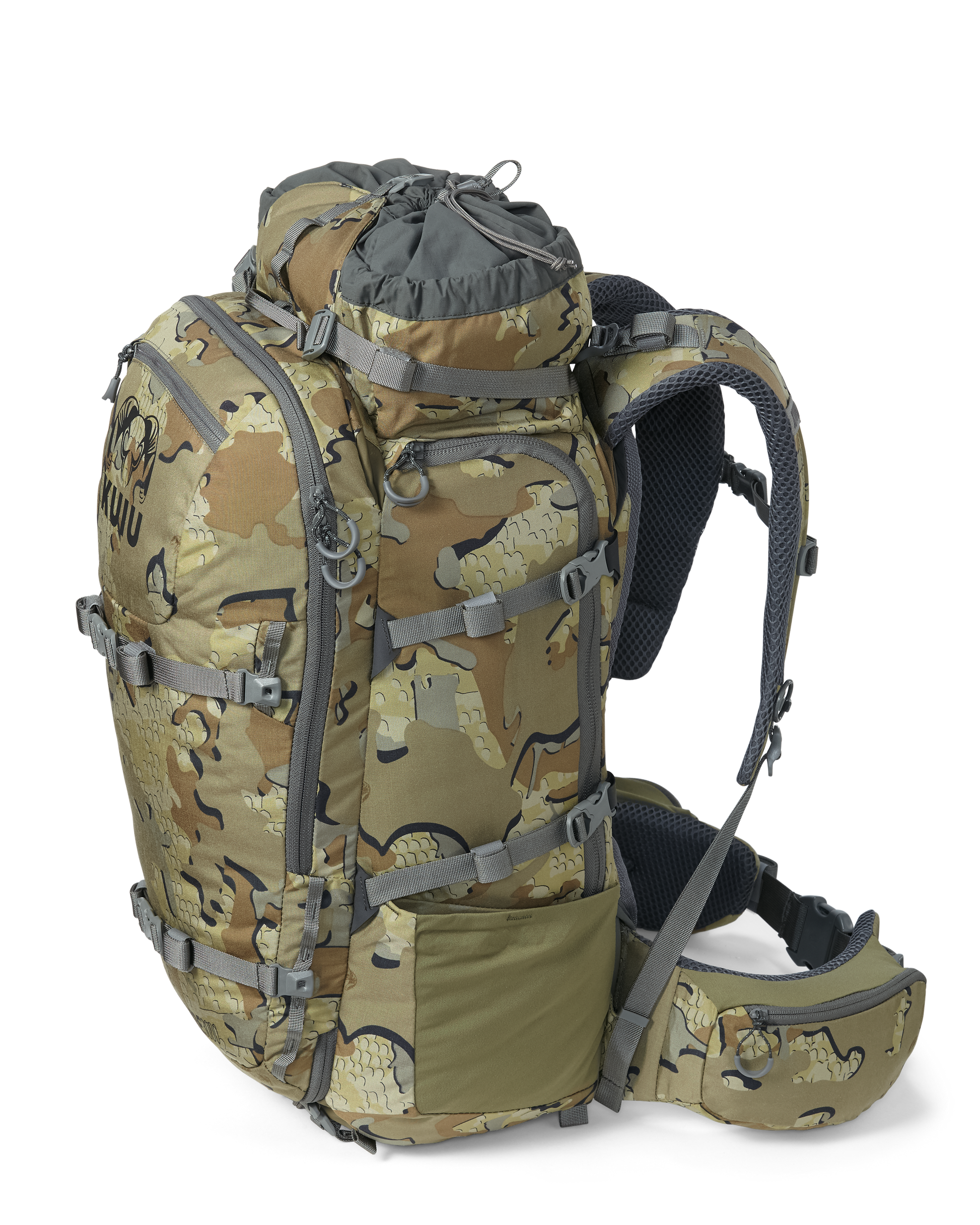 The main compartment is accessed through the side zipper or through the top shroud closure. The top shroud with dual cinch closures expands for extended capacity, keeping gear separate, or hauling taller items like a hind quarter.