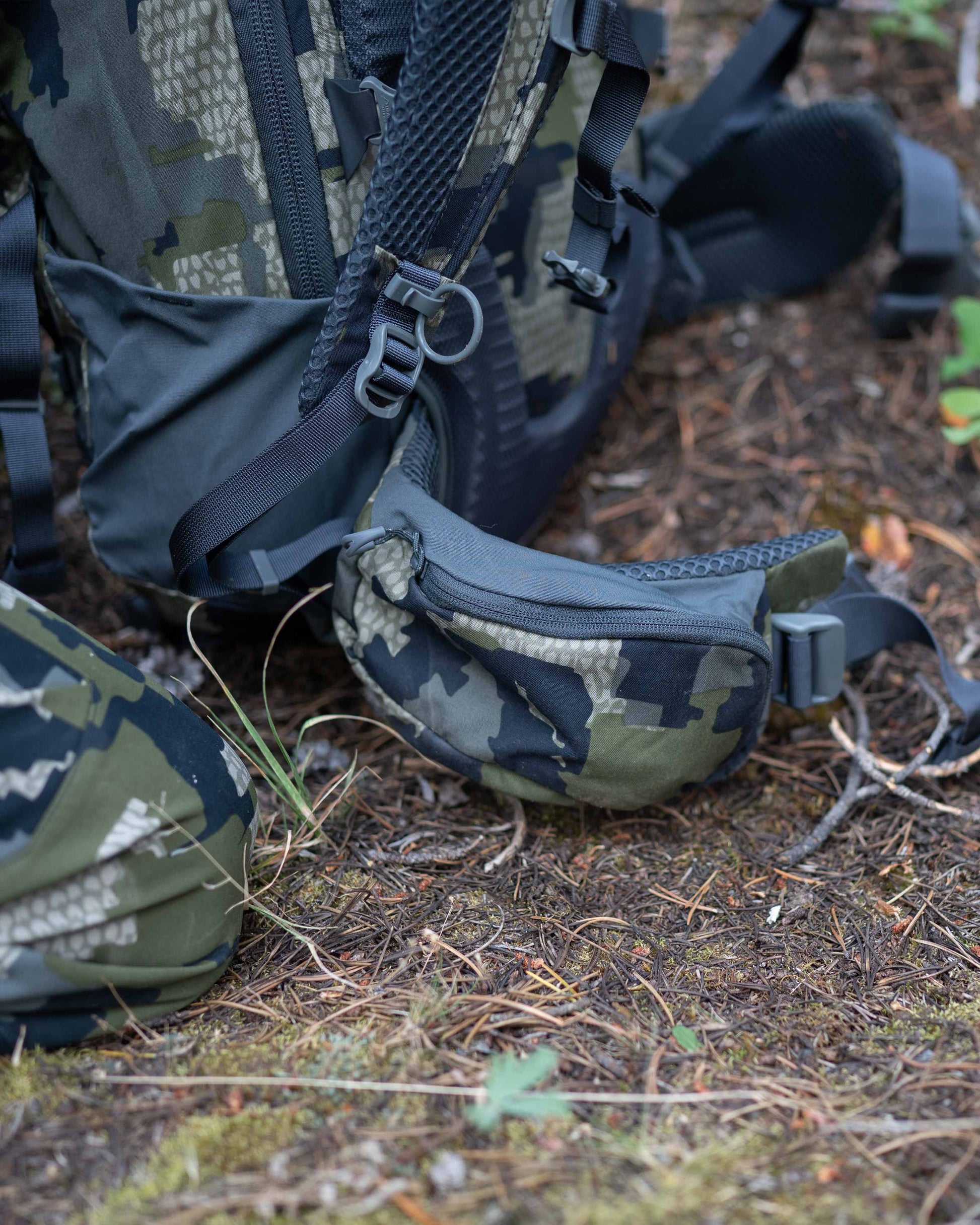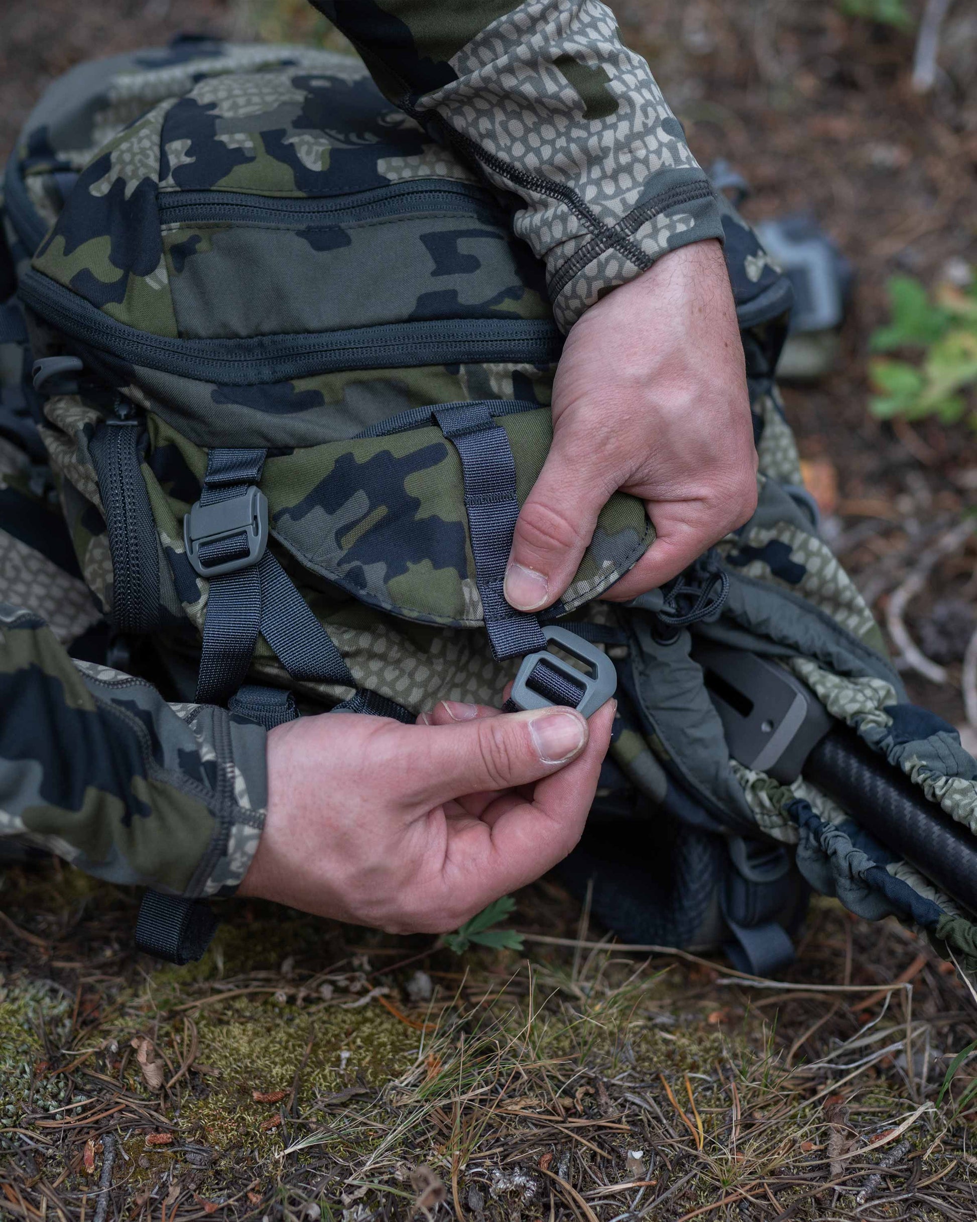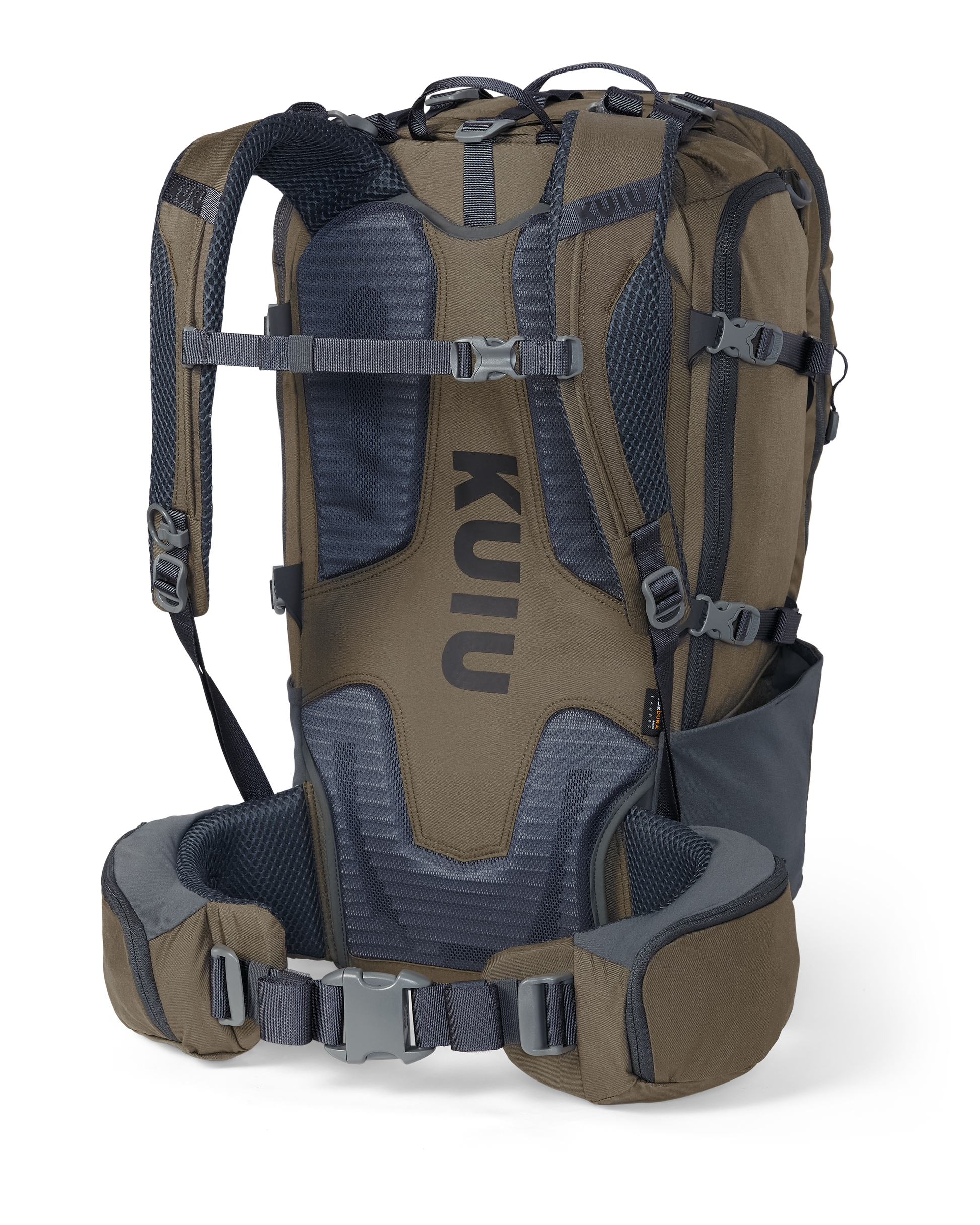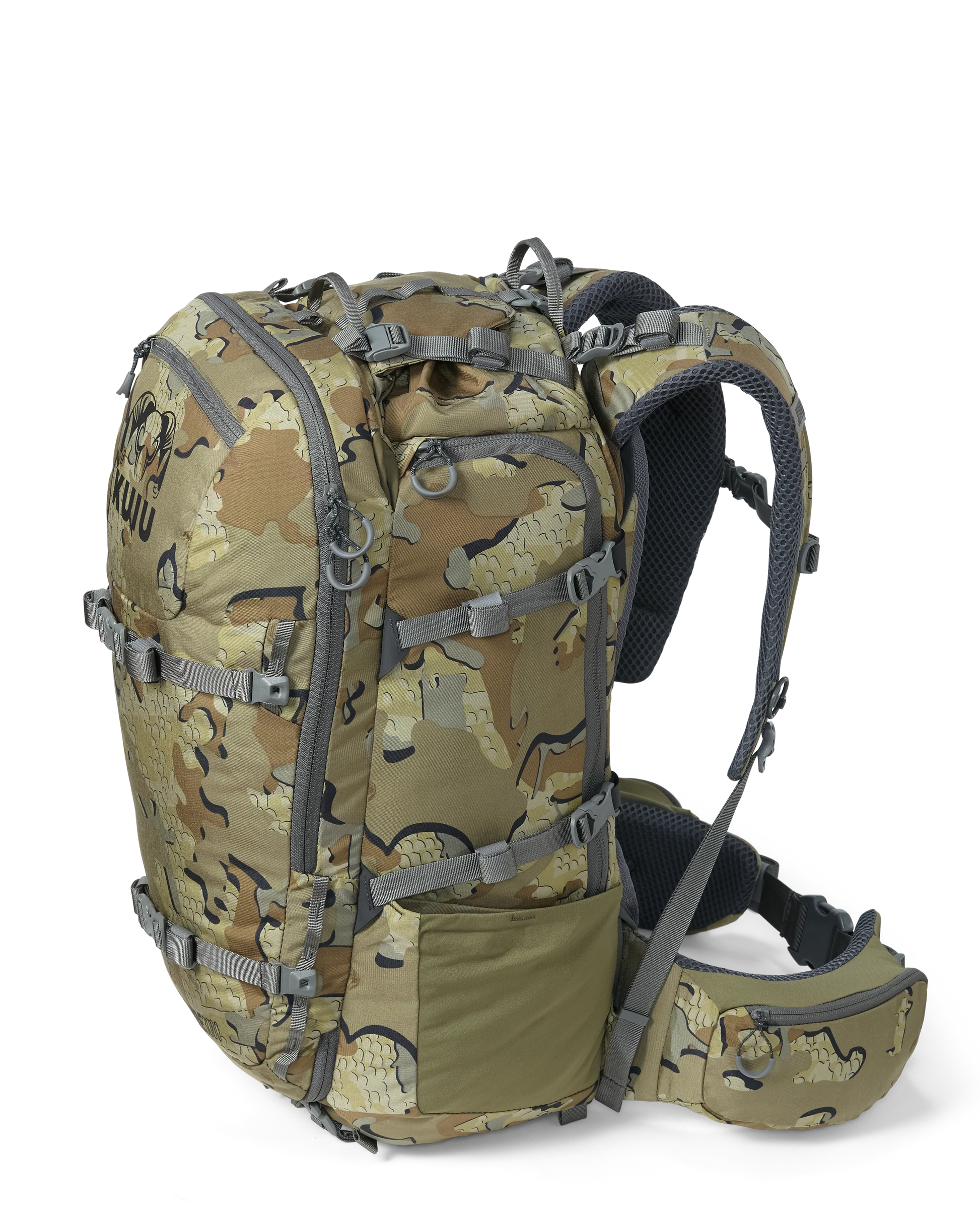 The main compartment is accessed through the side zipper or through the top shroud closure. The top shroud with dual cinch closures expands for extended capacity, keeping gear separate, or hauling taller items like a hind quarter.