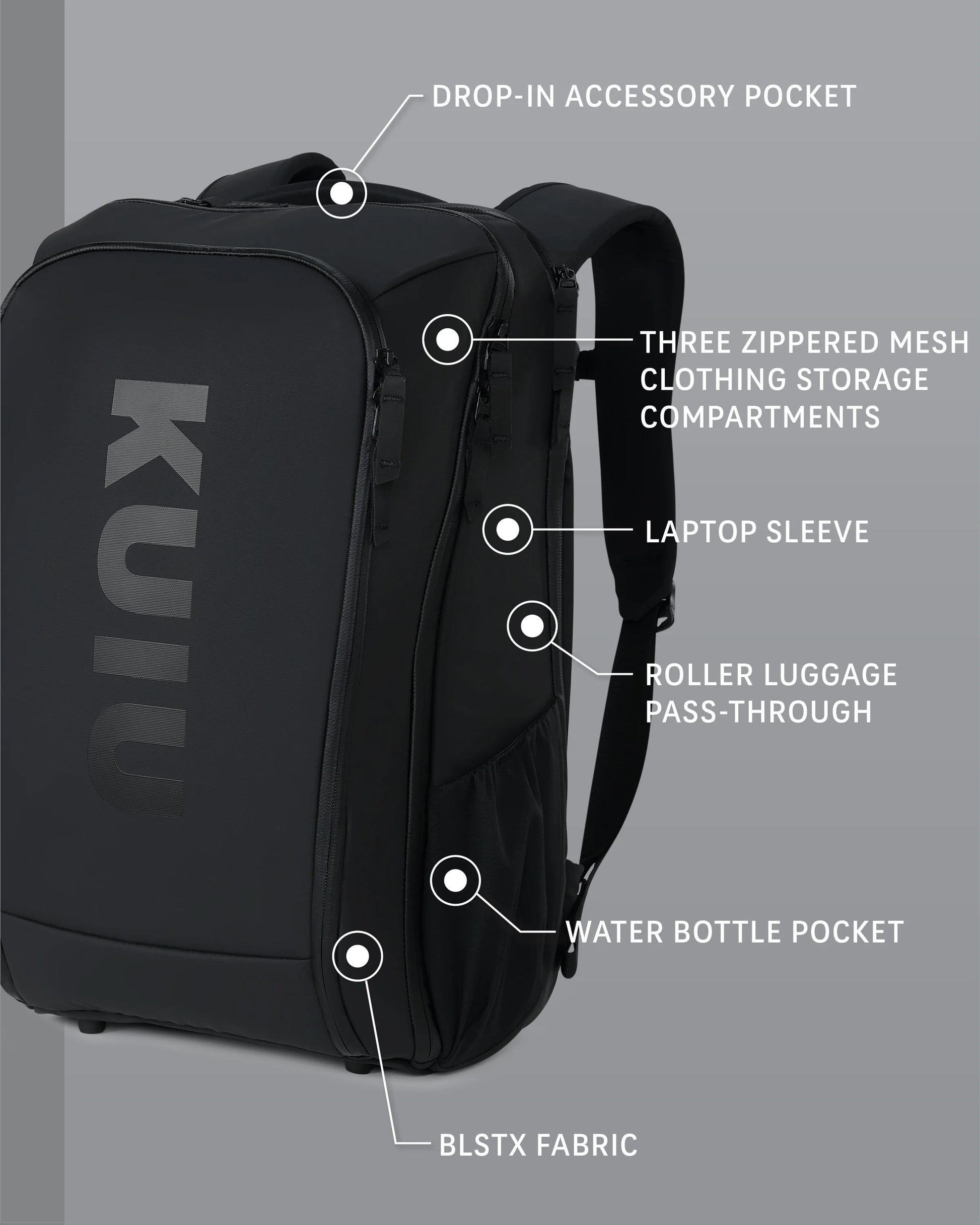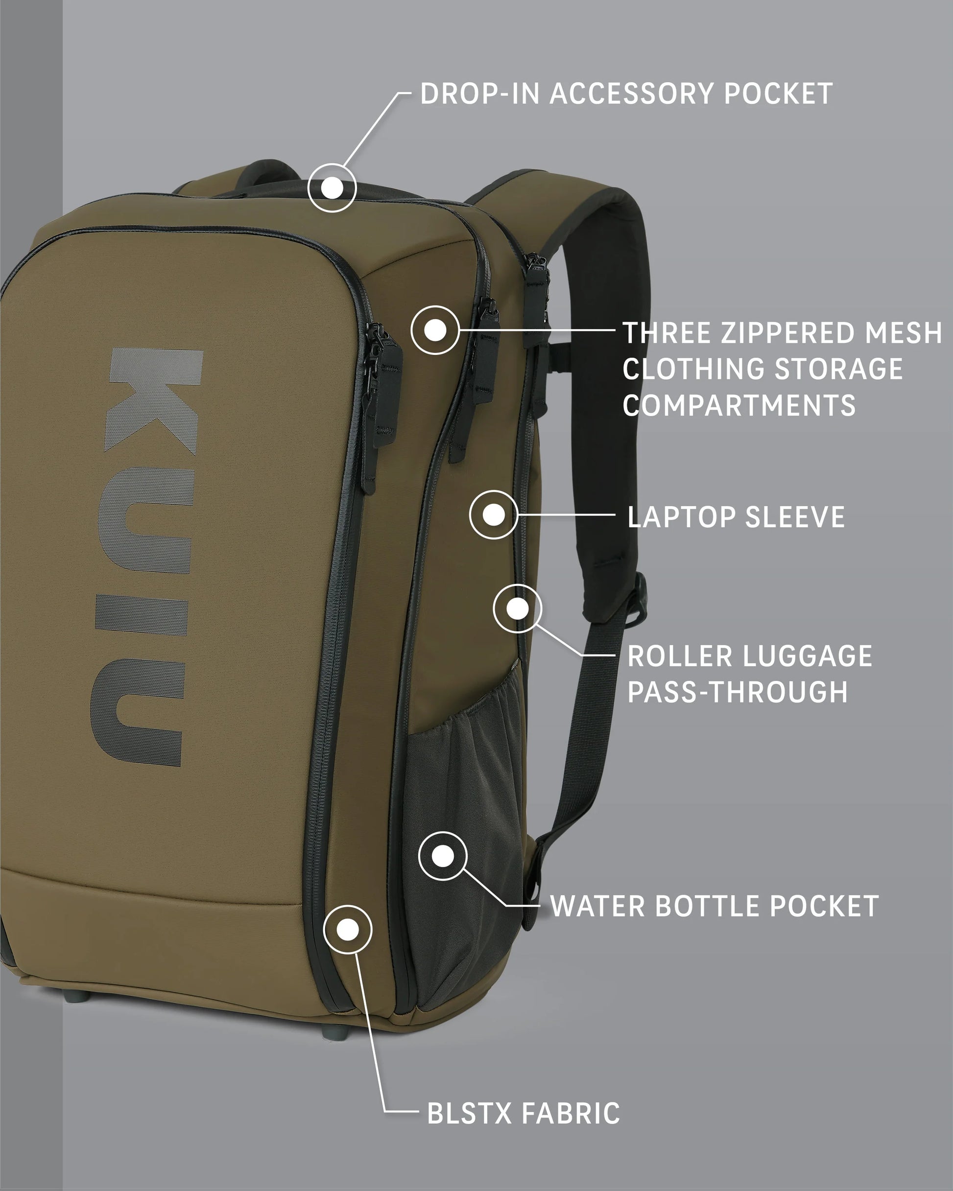 Built for durability and water resistance, it features 840D coated ballistic (BLSTX) nylon materials, premium Aquaguard water-resistant zippers, and well-thought-out zippered and drop-in internal pocketing. Key features include durable grab handles, a pass-through slot directly behind the back panel for securing it over a roller luggage handle, comfortable shoulder straps, and a stretch pocket large enough to handle a Nalgene water bottle.