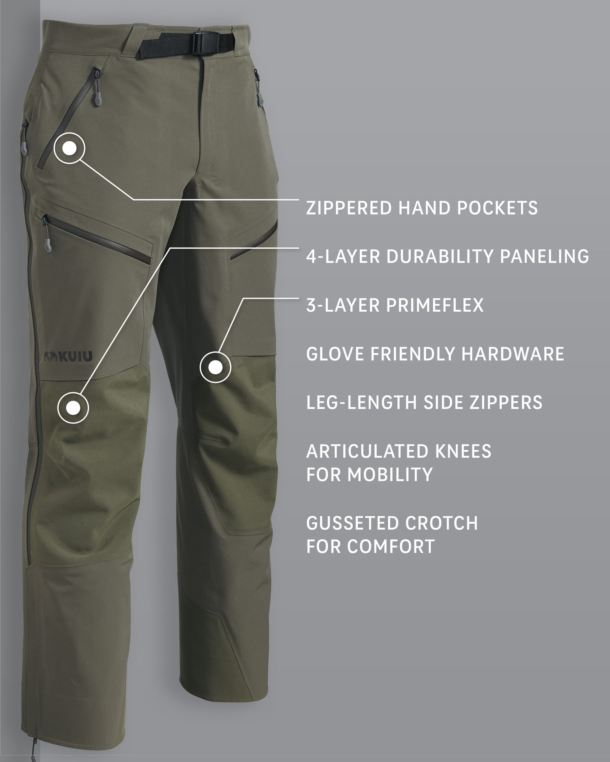 - Leg-length side zippers for easy on/off & ventilation